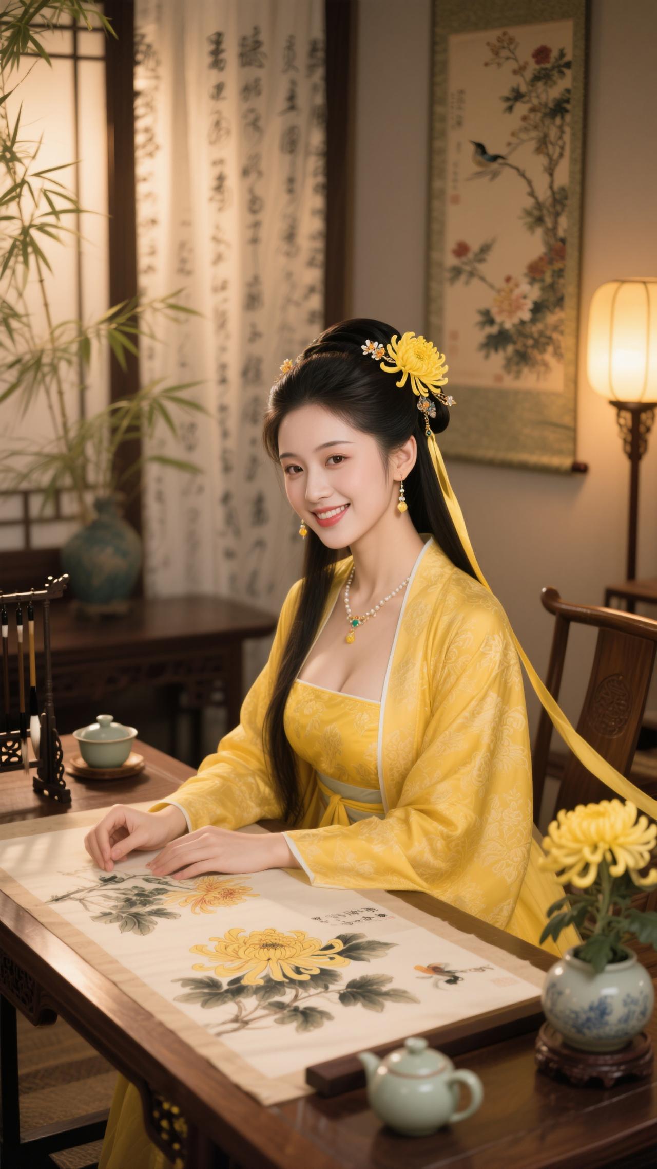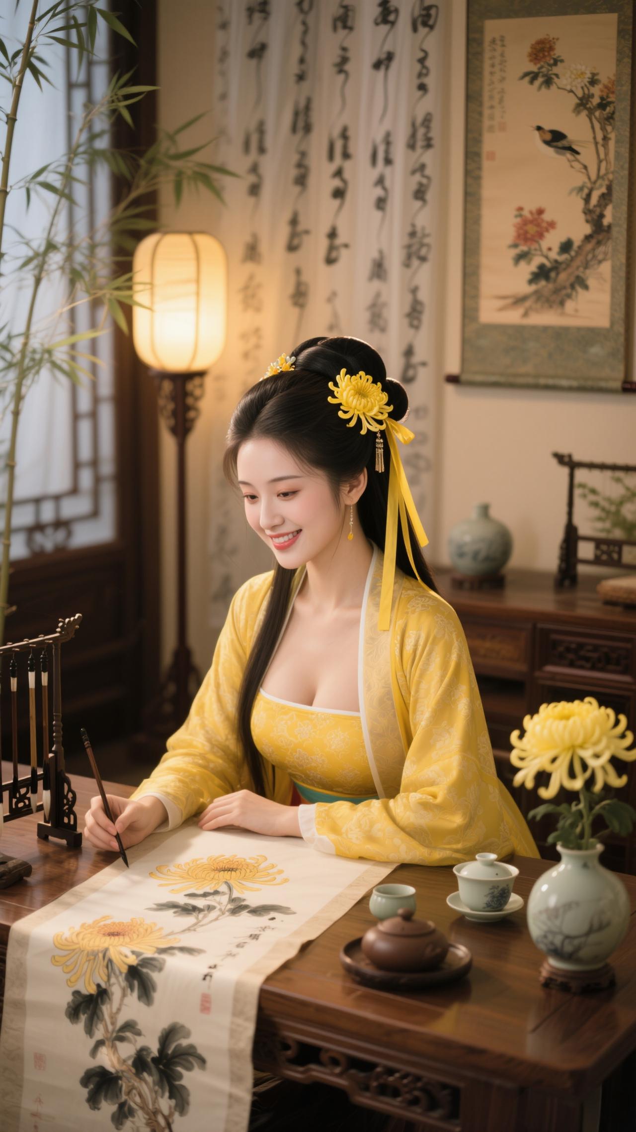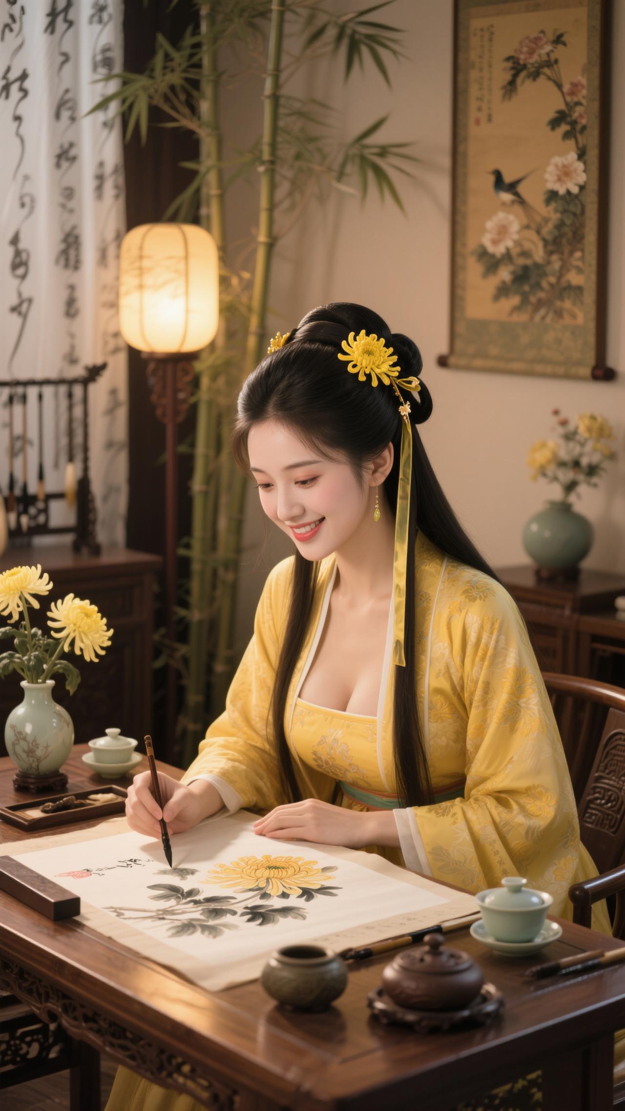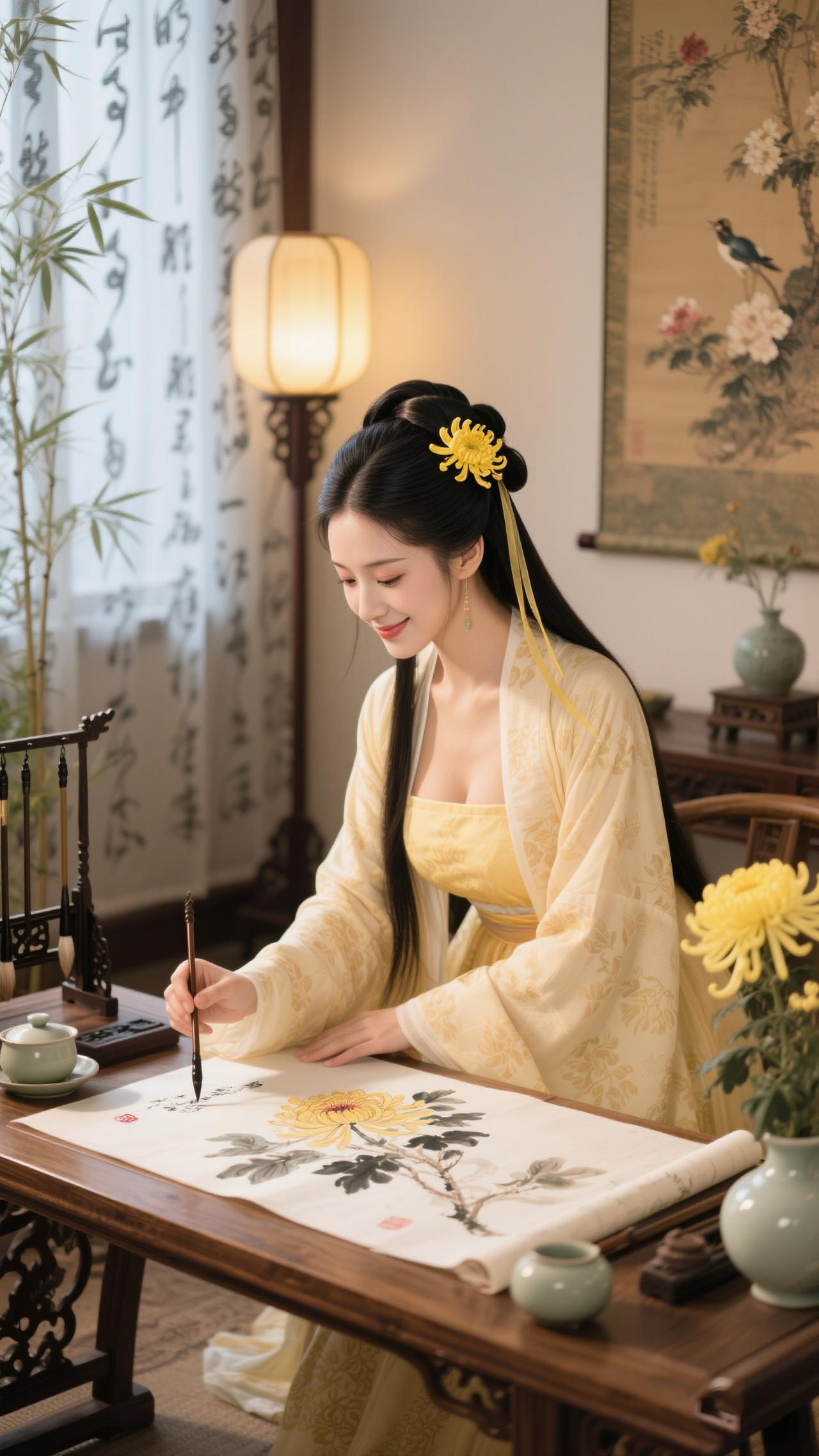 《鹧鸪天·画菊》 黄袂簪霜菊半枝,灯窗研墨画东篱。 竹风轻拂宣笺软,墨韵闲凝菊影奇。 毫欲舞,意先驰,笔端秋色入清诗。 不须借酒添豪气,自有寒香绕案迟。