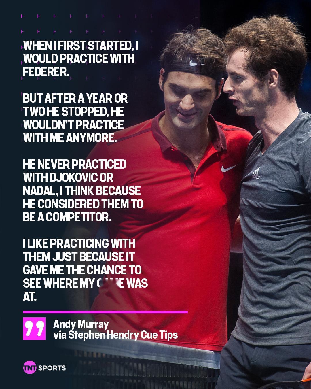 穆雷客串台球皇帝亨德利的播客节目,聊起四巨头当年,这段值得细品“我刚开始职业生涯的时候,会和费德勒一起训练,但过了一两年之后他就再也不和我练了。他从来没有和德约、纳达尔一起训练,因为他把他们视为竞争者。我喜欢和他们一起训练,因为这能让我看清我的网球处于什么水平。”