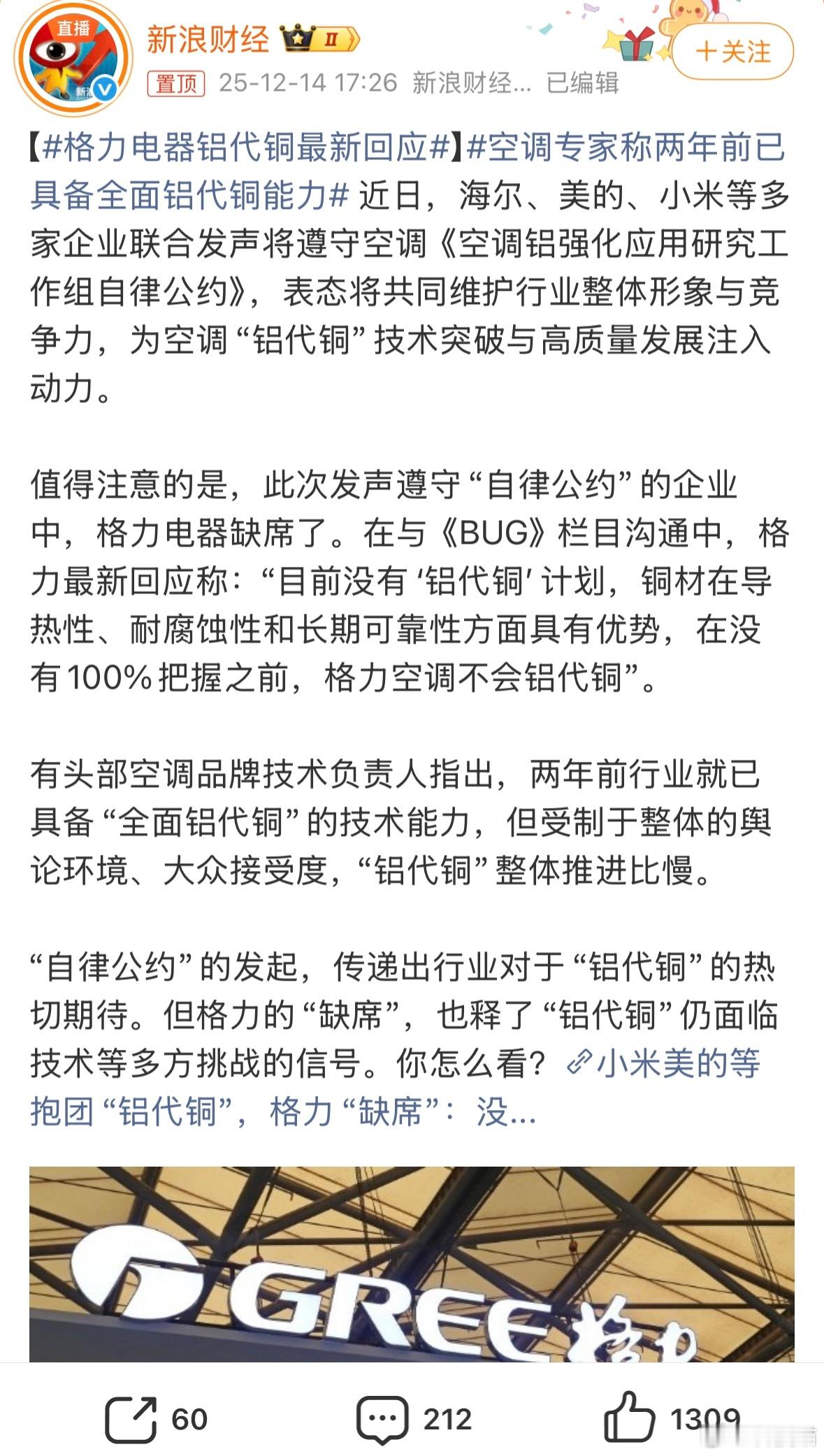 格力电器铝代铜最新回应:在没有100%把握之前,格力空调不会铝代铜”走着瞧吧……