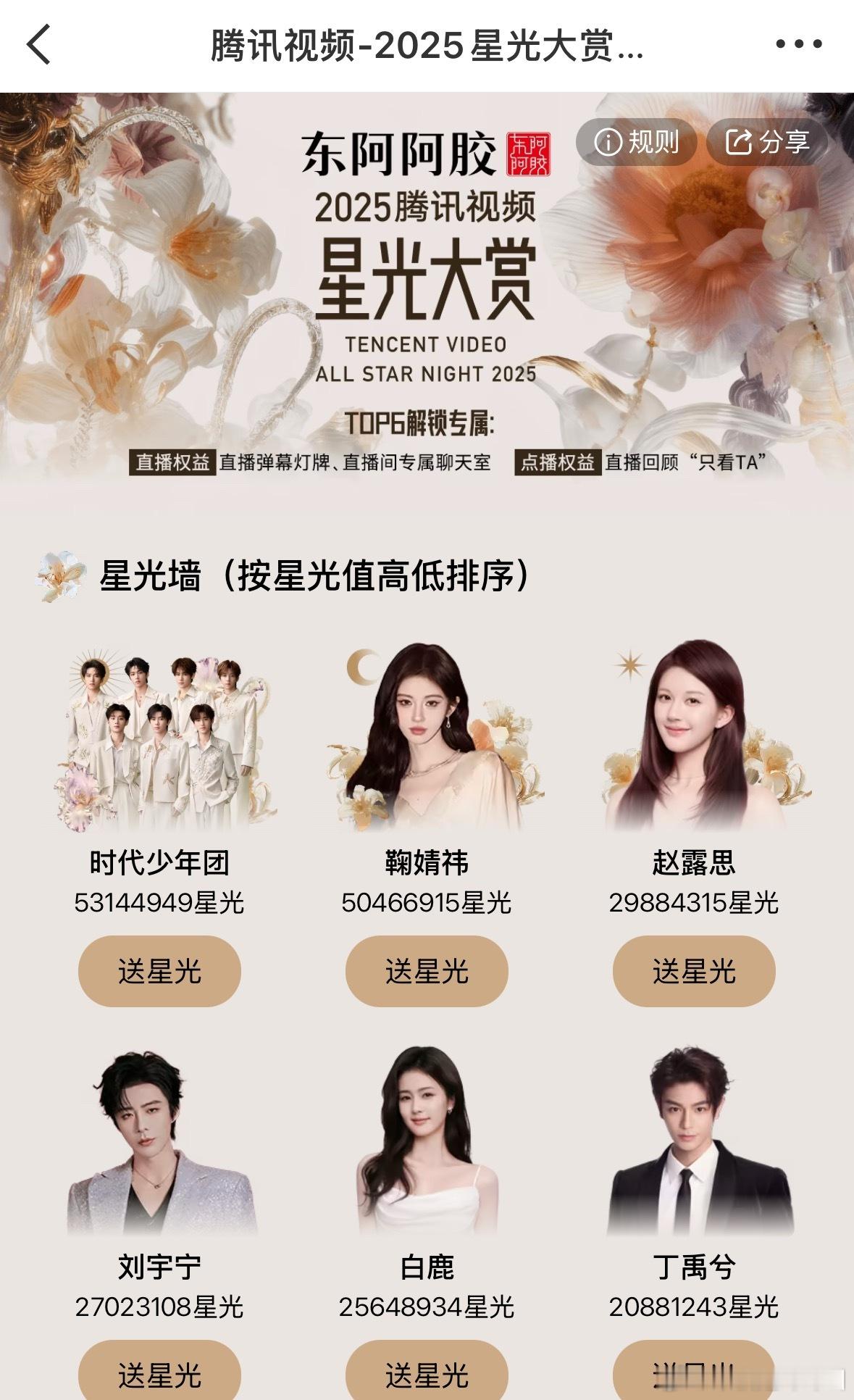🐧星光墙今天12:30结束,目前的前六是:时代少年团鞠婧祎赵露思刘宇宁