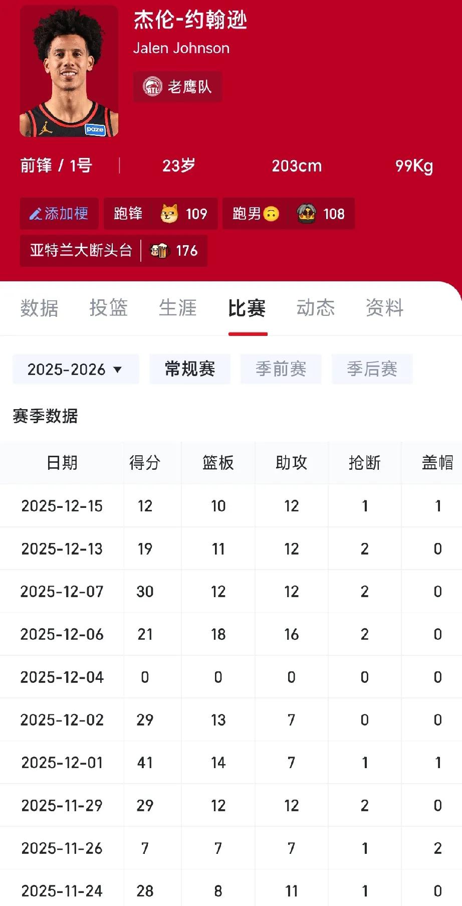 又一个三双魔王诞生,比威少和约基奇,东契奇还更厉害的三双王,杰伦约翰逊今天再次得到12分10板12助攻拿到三双,他成为了NBA历史上第三位在24岁前连续4场比赛拿到三双的球员,前两位是做到一次的魔术师和做到5次的罗伯特森。23岁363天的杰伦-约翰逊是自从1981年魔术师约翰逊之后,连续4场拿到三双的最年轻球员。 这一系列记录,现役三双厉害球员,比如威少,约基奇,东契奇,哈登,詹姆斯都没有做到!