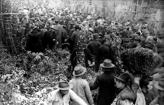 这是民国时期广州行花街,露天花田里攒着裹满市井热络的街坊,十有八九都扣着一顶挺括的礼帽,是那个年代广州男女都偏爱的装扮;有人穿长衫拢着袖子弯腰挑花,有人套短褂凑在花丛边跟花农搭话。 花丛里的花簇挤得热闹(该是菊花、年桔这类广州花街的传统年花),枝桠蹭着行人的衣角,没人急着赶路,都慢悠悠蹲在花畔挑拣,礼帽的檐角碰着檐角,花香气裹着人情味。