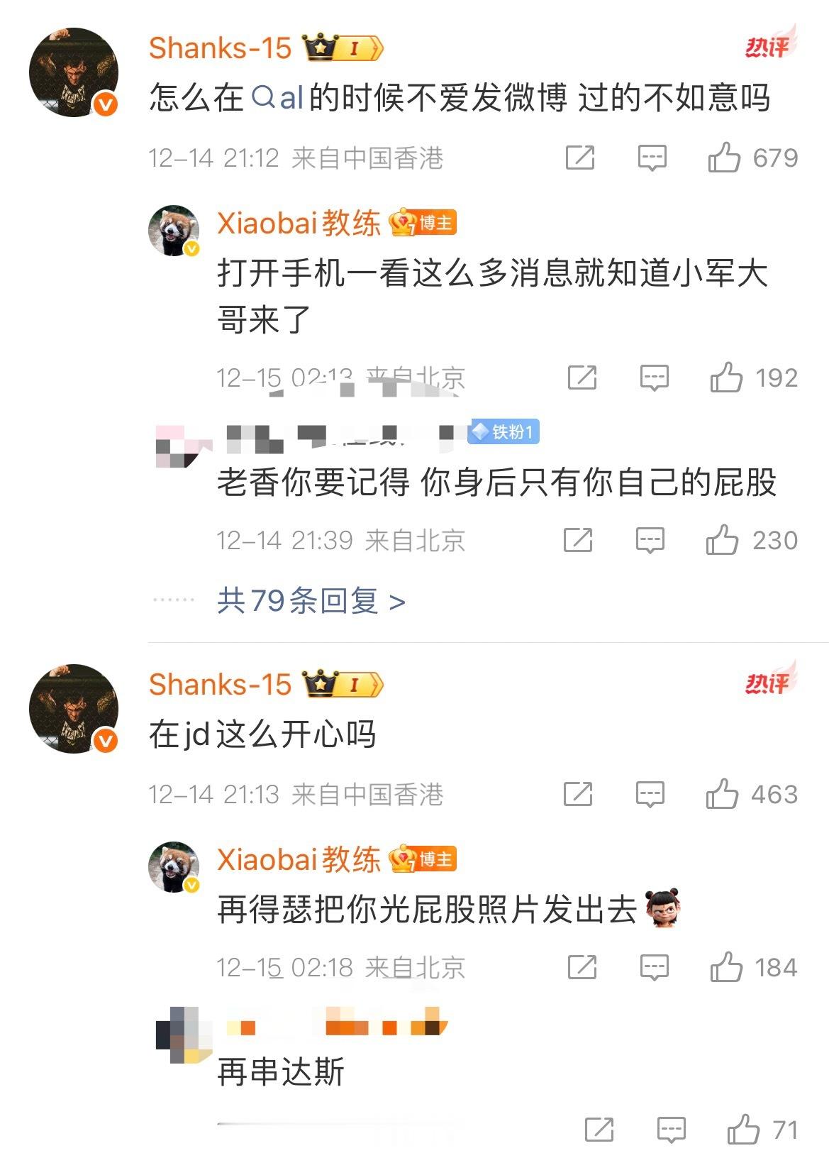 前AL教练小白发文记录生活,Shanks评论区三连问:怎么在al的时候不爱发微博?过的不如意吗?在jd这么开心吗?后续小白也回复:打开手机一看这么多消息就知道小军大哥来了,再得瑟把你光PP照片发出去!圈就需要多一些老香这种串子,就该多串串,大家和和气气一起分蛋糕,所谓的恩怨情仇,笑一笑就过去了shanks三问jdg教练faker连捧杯都在谦让shanks