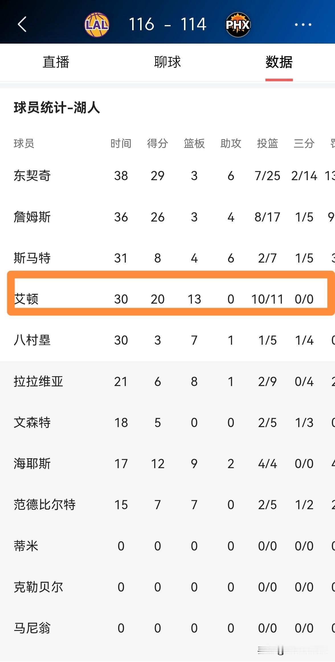 湖人首发中锋艾顿真是完全吃饱了!在今天湖人客场以116:114击败太阳的比赛中,艾顿首发出战30分钟,投篮11中10得到20分13篮板2抢断1盖帽,不过他的场上正负值为-12。 总而言之,本场比赛艾顿在篮下是予取予求,他被东契奇和詹姆斯喂的饱饱的。