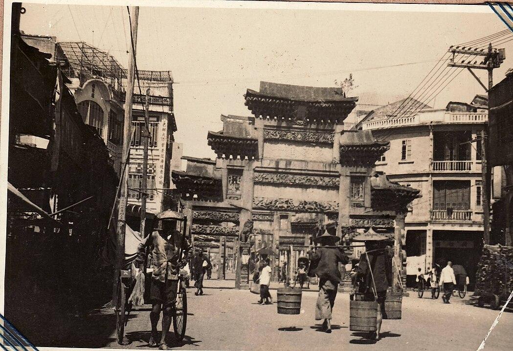 这是民国时期广州四牌楼一带的街景,画面中央立着雕饰繁复的传统石牌坊,多层翘檐裹着岭南古建的精巧。 牌坊两侧,左有带骑楼的旧式商铺,右是带阳台的洋派楼房,电线杆牵着电线斜跨街巷,街上更浸着市井热络:黄包车夫攥着车把候在路边,挑担小贩扛着水桶快步穿行,行人裹着长衫、短褂,有人戴斗笠遮日,脚步声、车铃声像要从画面里漫出来。