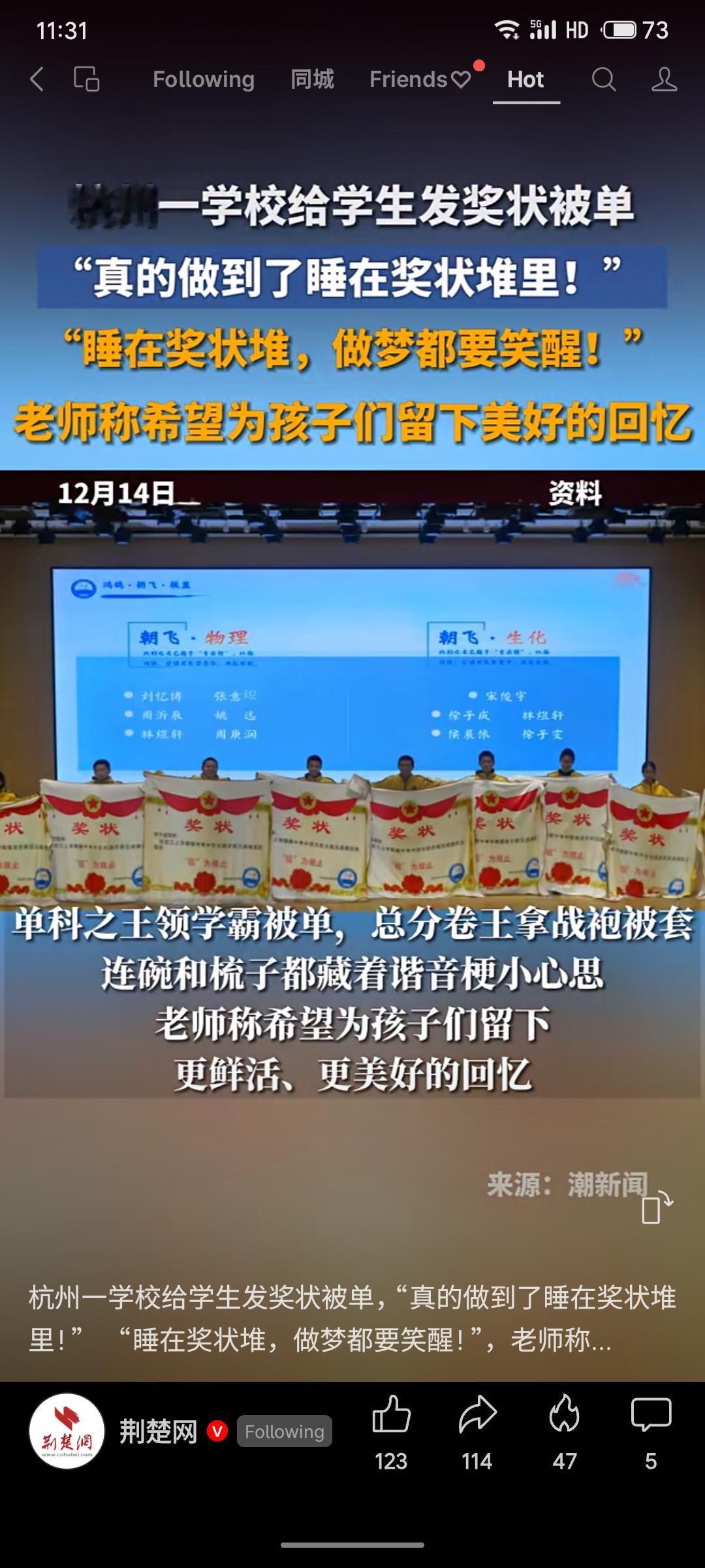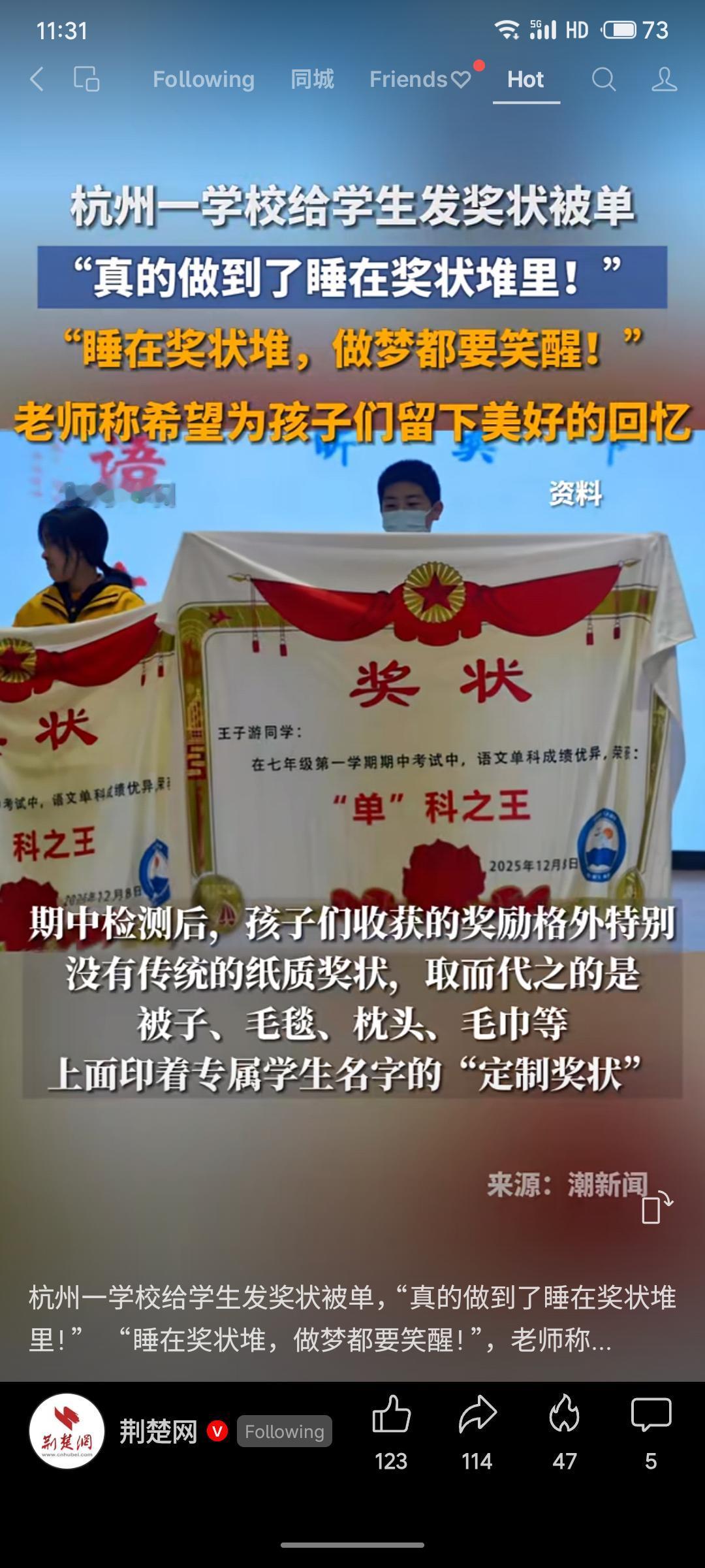 杭州某学校创新奖励形式,为学生发放印有姓名和荣誉的定制被单、毛毯等作为“奖状”,