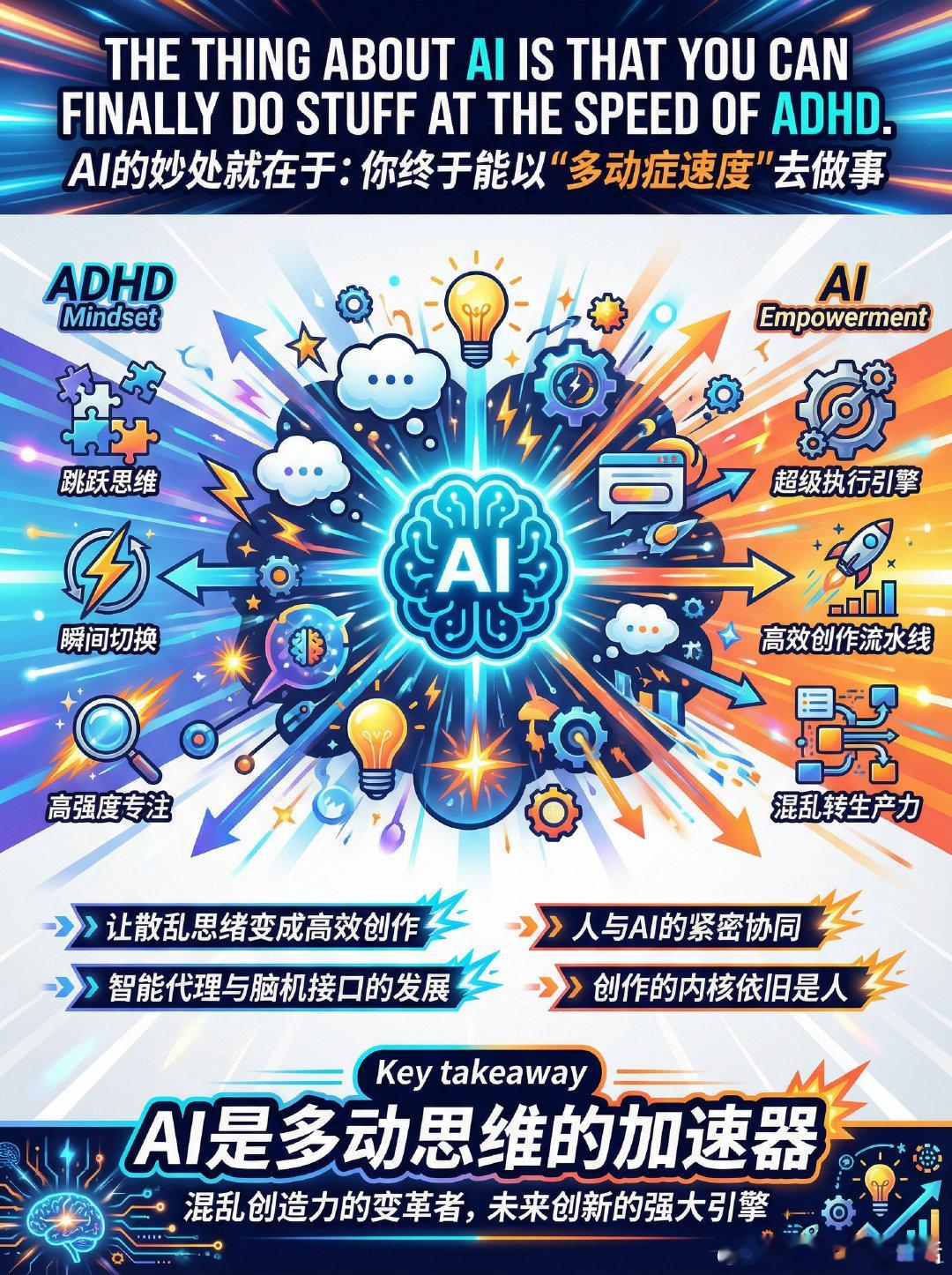 “The thing about AI is that you can finally do stuff at the speed of ADHD”AI 的妙处就在于:你终于能以“多动症速度”去做事。 很多人感同身受:这不仅是速度的提升,更是思维模式的共振。AI像个超级执行引擎,完美匹配那些跳跃、探索、瞬间切换的脑回路。它让散乱的思绪变成高效的创作流水线,把“混乱”转化为生产力。 对于有注意力缺陷(ADHD)的人来说,这简直是天赐良机——让他们的快速切换和高强度专注都得以释放,成就感和效率同时爆棚。AI让“兴趣转移”的速度跟上你的节奏,产品和点子早已上线。 未来更让人期待:随着智能代理和脑机接口的发展,这种人与AI的协同将更紧密,速度和创造力也会被进一步放大。 然而,门槛虽然降低,真正需要的仍是勇气和决心。AI能赋能加速,但创作的内核依旧是人。 AI是多动思维的加速器,是混乱创造力的变革者,也是未来创新的强大引擎。 原文链接:x.com/beffjezos/status/2000128435302375660