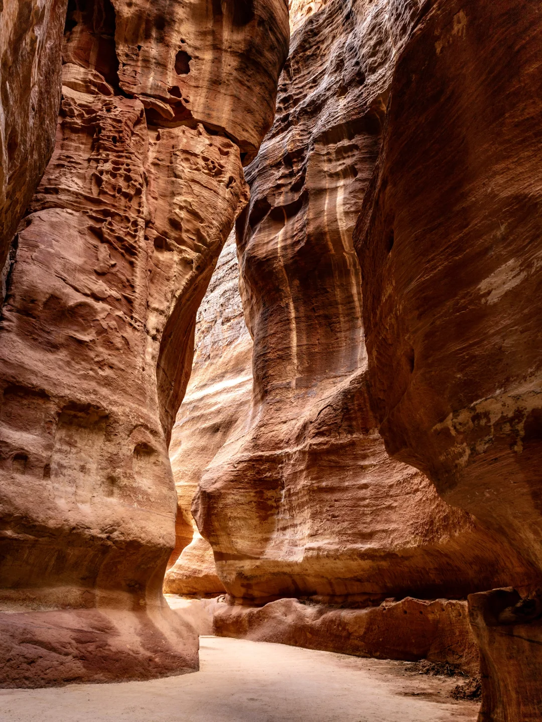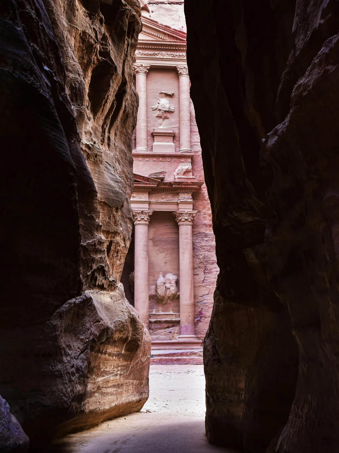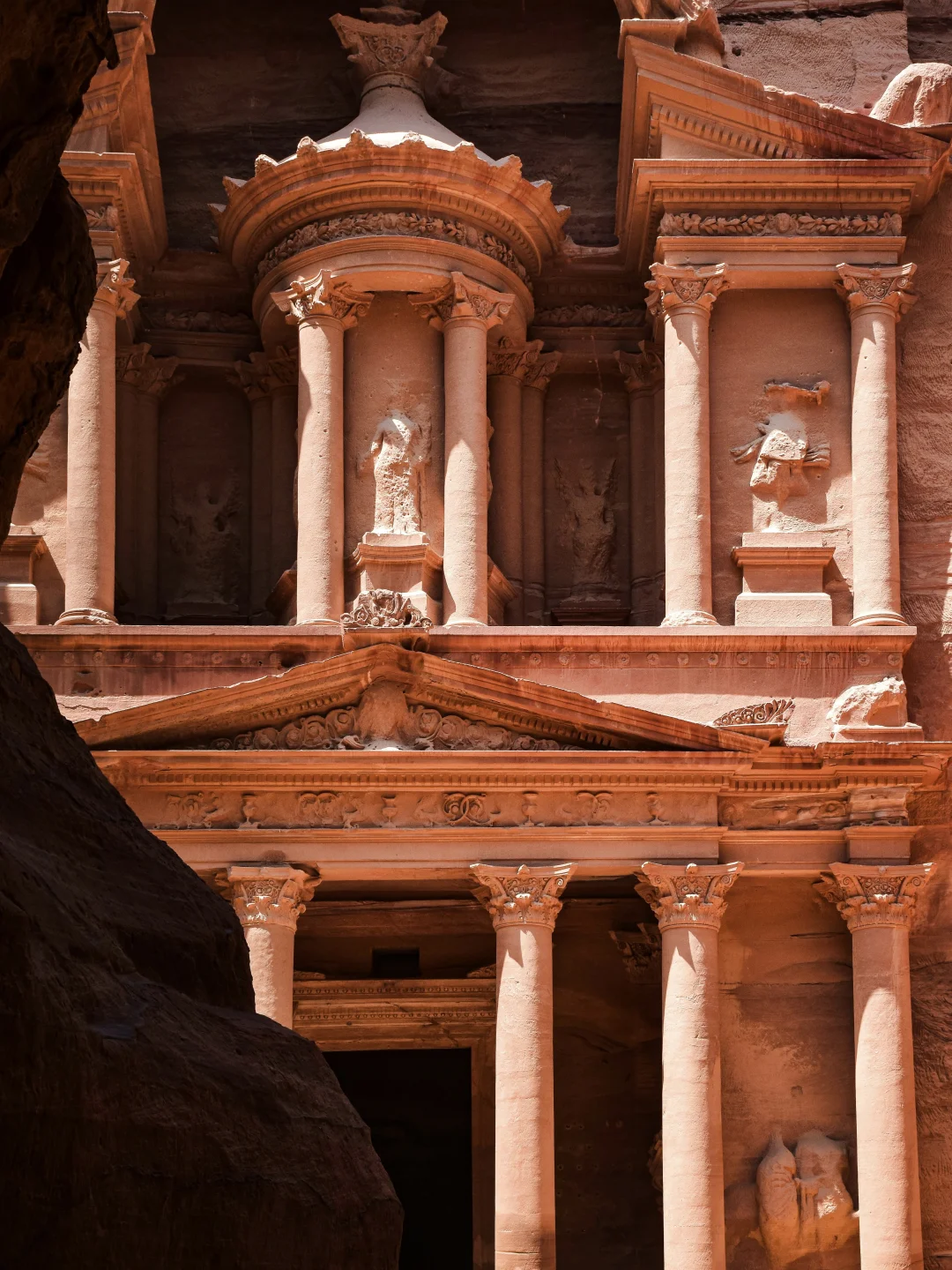 进入佩特拉需要穿过长约1.2公里的狭窄峡谷“西克峡谷”,两侧岩壁高耸,光影不断变化,仪式感极强。峡谷尽头豁然开朗,最经典的建筑“宝库”(Al-Khazneh)突然出现,这是佩特拉的标志性画面,也是《夺宝奇兵》等电影的取景地。