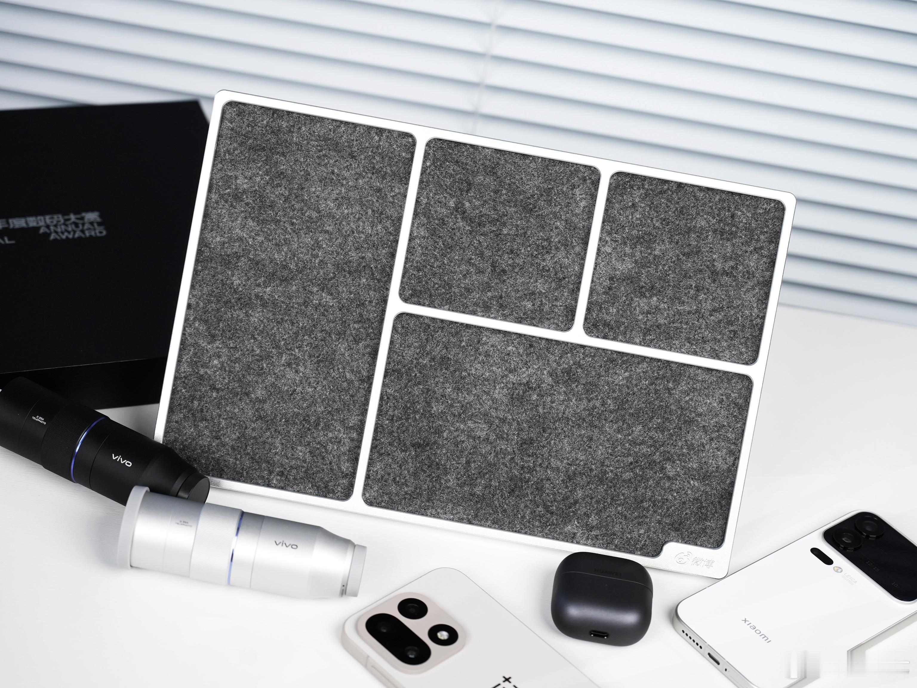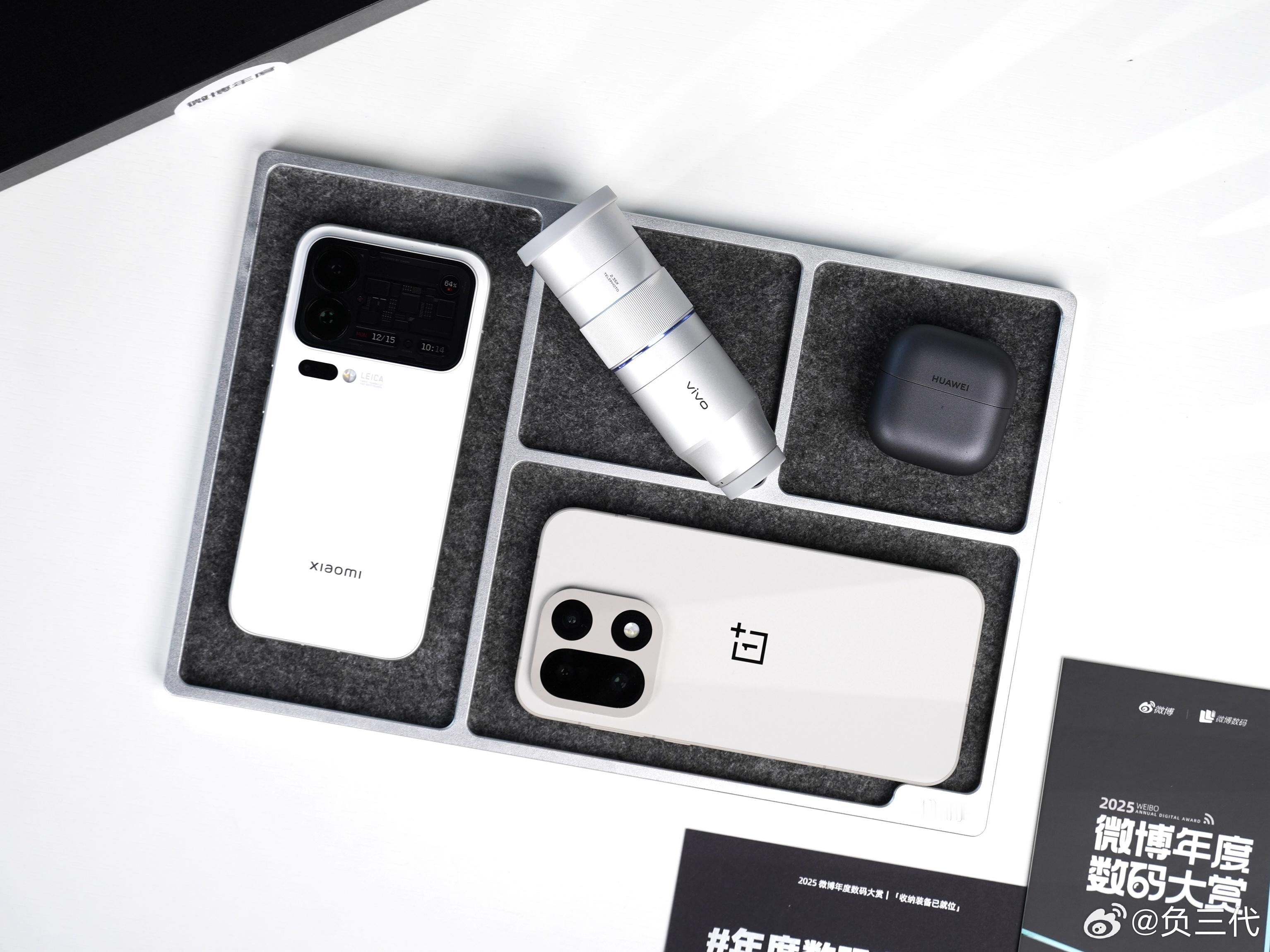 又是一年一度的微博年度数码大赏,不得不说官方太会了,知道咱装备多,特意安排了个质感超顶的铝合金收纳盘,底部还是植绒设计,防止划伤设备,非常细节要说2025年给我留下深刻印象的数码单品还真不少,首当其冲还得是vivo的长焦增距镜,和小伙伴们去大西北团建那会儿我就带着它,指哪打哪,几百米开外也能拿捏,距离根本不是问题。而且后来vivo X300全系适配,真的很难不爱要说最惊喜的手机,先得是小米17 Pro,你别说,平时用起来,它这个背屏的存在感是真强,再加上复古游戏手机壳,我时不时就想翻过来戳两下,比打电脑都有得劲,情绪价值是真给足了再有就是一加15「原色沙丘」,我再强调一次,它的质感真的非常权威,摸过的懂的都懂好吧,而且中框比后盖更惊艳,165Hz超超超高刷新率旦用难回,打游戏快人一步,还用多说什么呢另外还有华为Free Clip 2耳夹耳机,体积比第一代小很多,佩戴依旧无感,但音质更强,续航更强,说真的,不管你用什么手机,都可以考虑来用用这款耳机年度数码宝藏清单