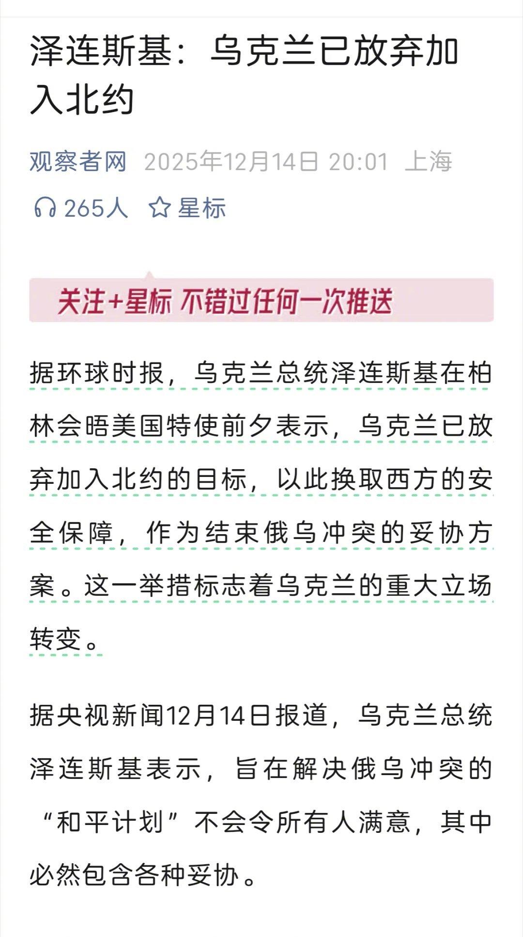 有媒体发文,泽连斯基宣布乌克兰已放弃加入北约。 有很多大V评论说这个决定迟到了近四年。 你们认同这个说法吗?