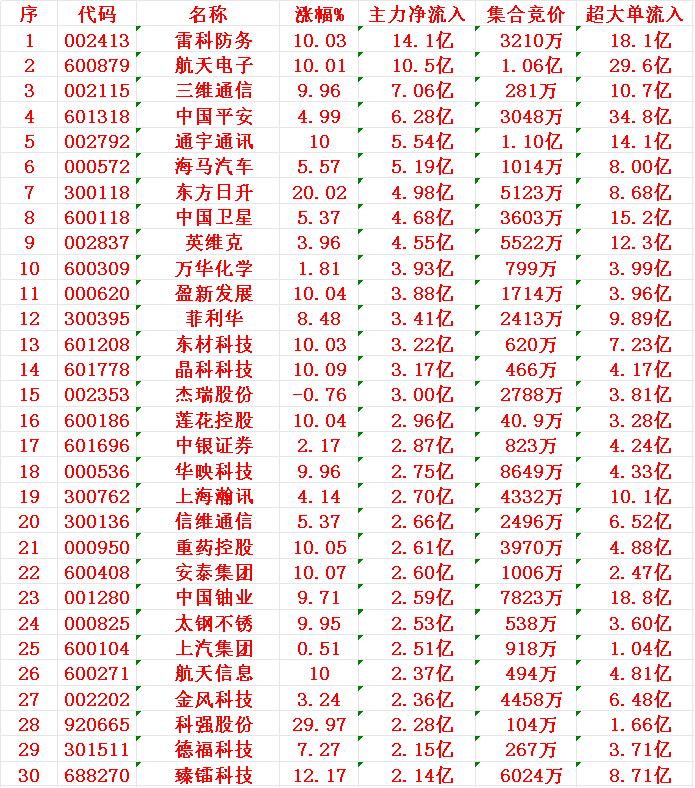 12月15日收盘,主力资金,已经大幅卖出的30名单: 长盈精密:净流出14.7亿元 立讯精密:净流出13.1亿元 中科曙光:净流出10.1亿元 阳光电源:净流出10.1亿元 工业富联:净流出9.65亿元 航天发展:净流出8.34亿元 摩尔线程-U:净流出7.47亿元 中兴通讯:净流出7.39亿元 三花智控:净流出7.17亿元 紫金矿业:净流出6.36亿元 和而泰:净流出6.27亿元 12月15日收盘,主力资金“大幅买入”的30名单: 雷科防务:净流入14.1亿元 航天电子:净流入10.5亿元 三维通信:净流入7.06亿元 中国平安:净流入6.28亿元 通宇通讯:净流入5.54亿元 海马汽车:净流入5.19亿元 东方日升:净流入4.98亿元 中国卫星:净流入4.68亿元 英维克:净流入4.55亿元 万华化学:净流入3.93亿元 盈新发展:净流入3.88亿元 菲利华:净流入3.41亿元 东材科技:净流入3.22亿元 晶科科技:净流入3.17亿元 杰瑞股份:净流入3.00亿元