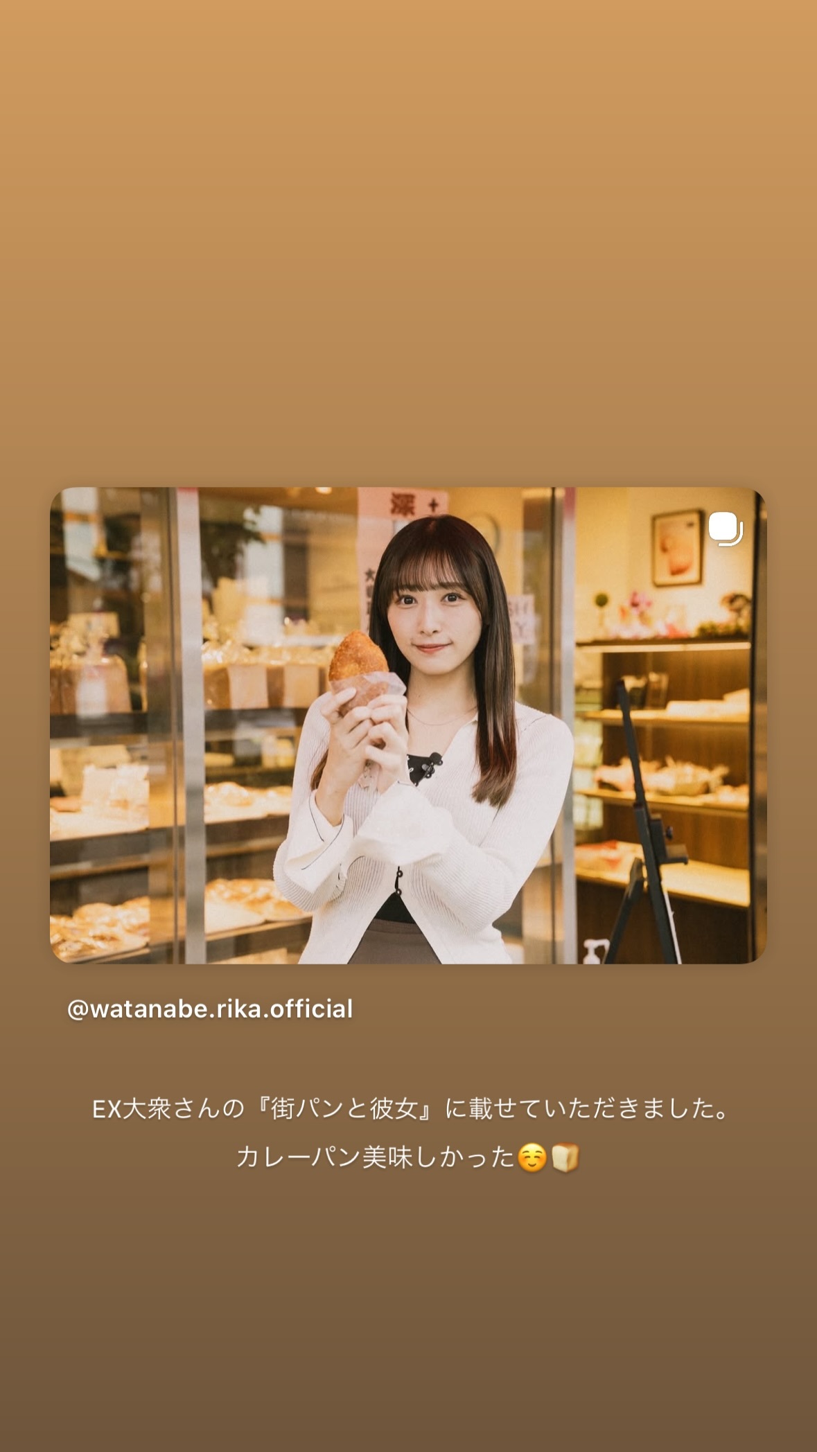 渡辺梨加「EX大衆さんの『街パンと彼女』に載せていただいています。元祖カレーパンが有名なカトレアさんに行ってきました🍞カレーが甘くて優しい味で、何個でも食べられちゃうカレーパンでした🍛あったかくて優しいお店でまた行きたいなって思いました☺️カトレア」