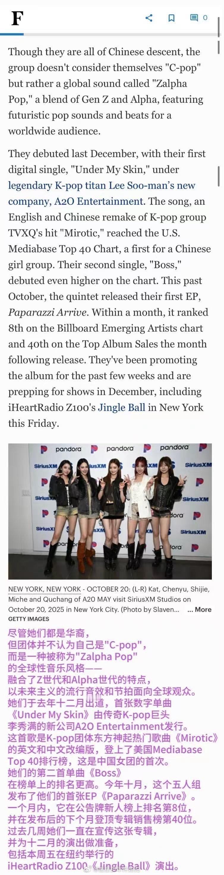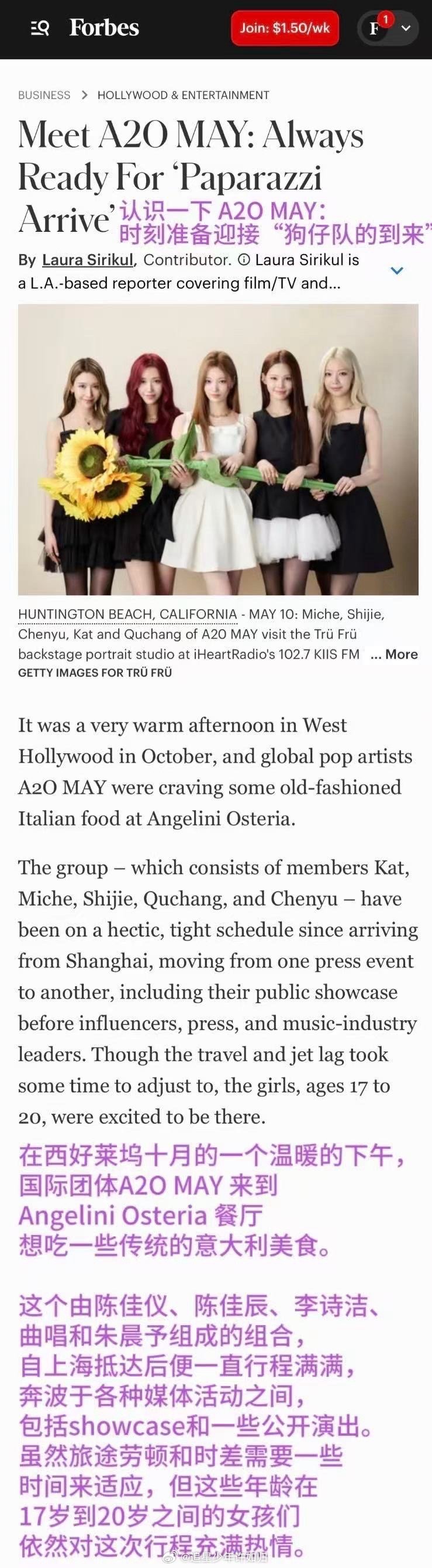 中国女团A2OMAY首次接受福布斯专访 太争气了!A2OMAY成为首个登上福布斯专访的中国女团,美国行交出亮眼成绩单,采访里揭秘的成长故事、幕后细节,都藏着她们一步步走到舞台中央的努力~