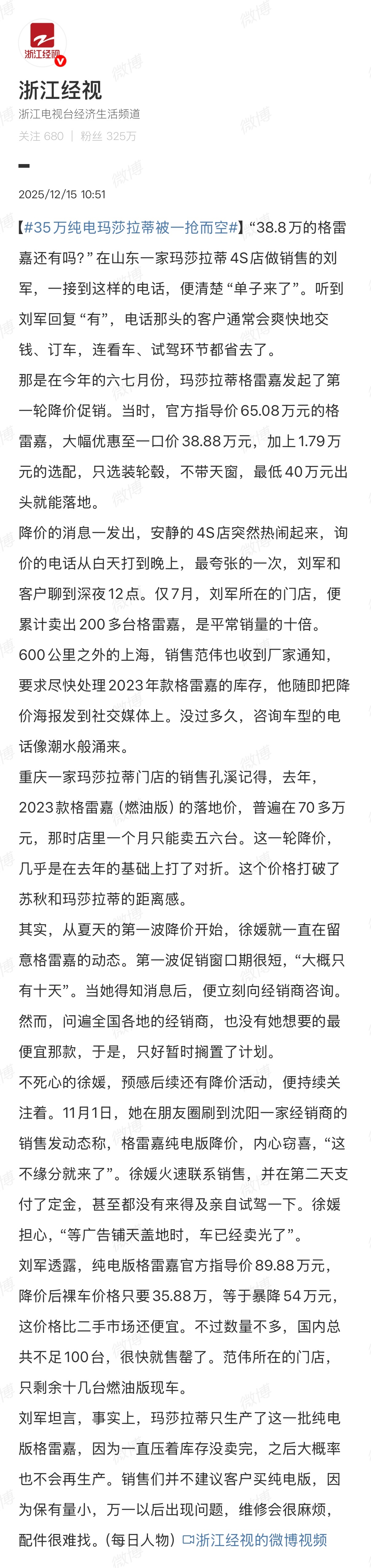 35万纯电玛莎拉蒂被一抢而空 落地40万左右的玛莎确实很香 但是作为即将停产的的车型 后续的维修升本问题怎么办?这波到底算是“捡漏”还是…