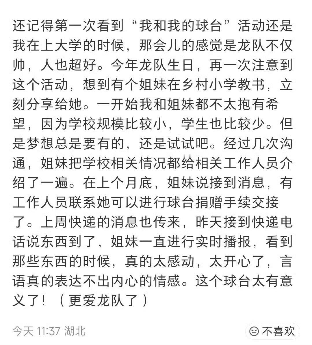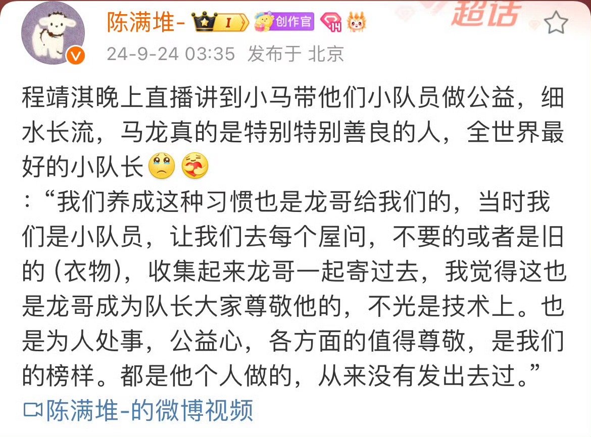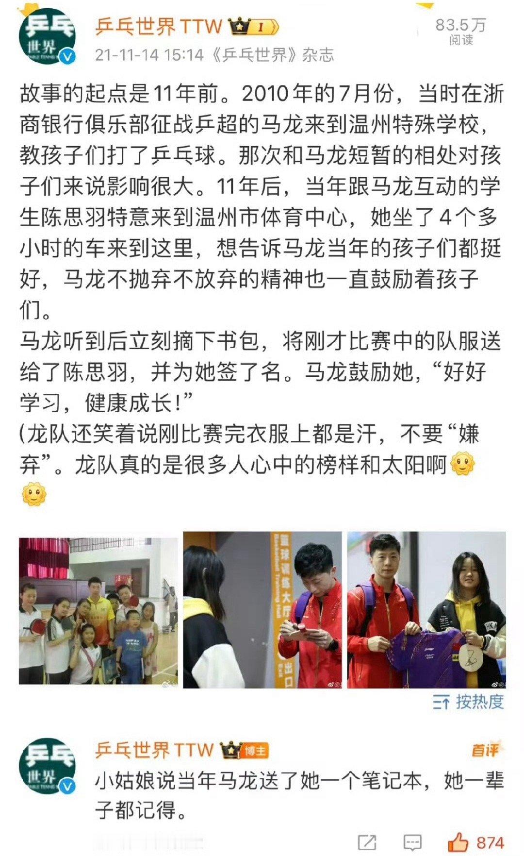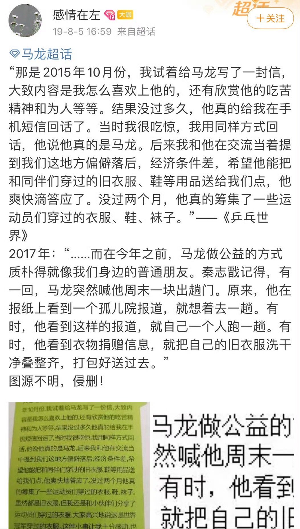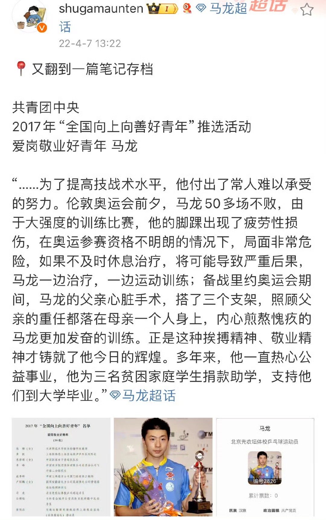 有时候想一想也会觉得好委屈,前同事团队给马龙下黑水分析面部微表情截取几帧画面造谣他伪善的时候,马龙本人在支持贫困地区体育教育发展这件事上默默耕耘了十年整,和鄂尔多斯的公益活动也会介绍队友去,从很小就开始资助贫困学生读书,还带着队里的小队员把旧衣物捐赠给需要的人,大家常说君子论迹不论心,但我想十年如一日的善行和数不尽的美谈还不能为这颗赤诚的心作证的话,对他的标准实在是严苛的有些不合常理了吧。