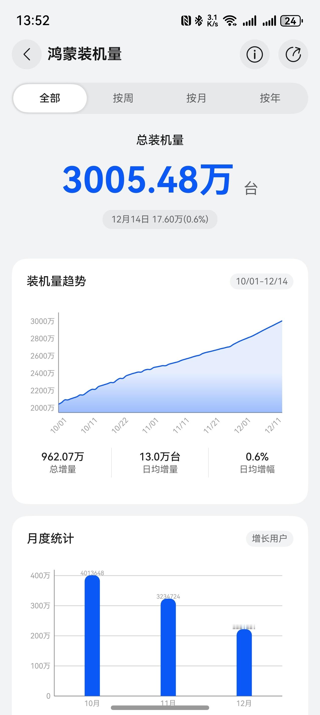热烈祝贺鸿蒙系统总装机量突破3000w下一个目标农历新年前突破4000w63天1000w激活,平均一天不到16w难度不大啊nova15系列会卖的很好的目标可以提一提了还是挑战一下农历新年前突破4500w吧均摊下来需要平均一天不到24w激活这个还可以,努努力