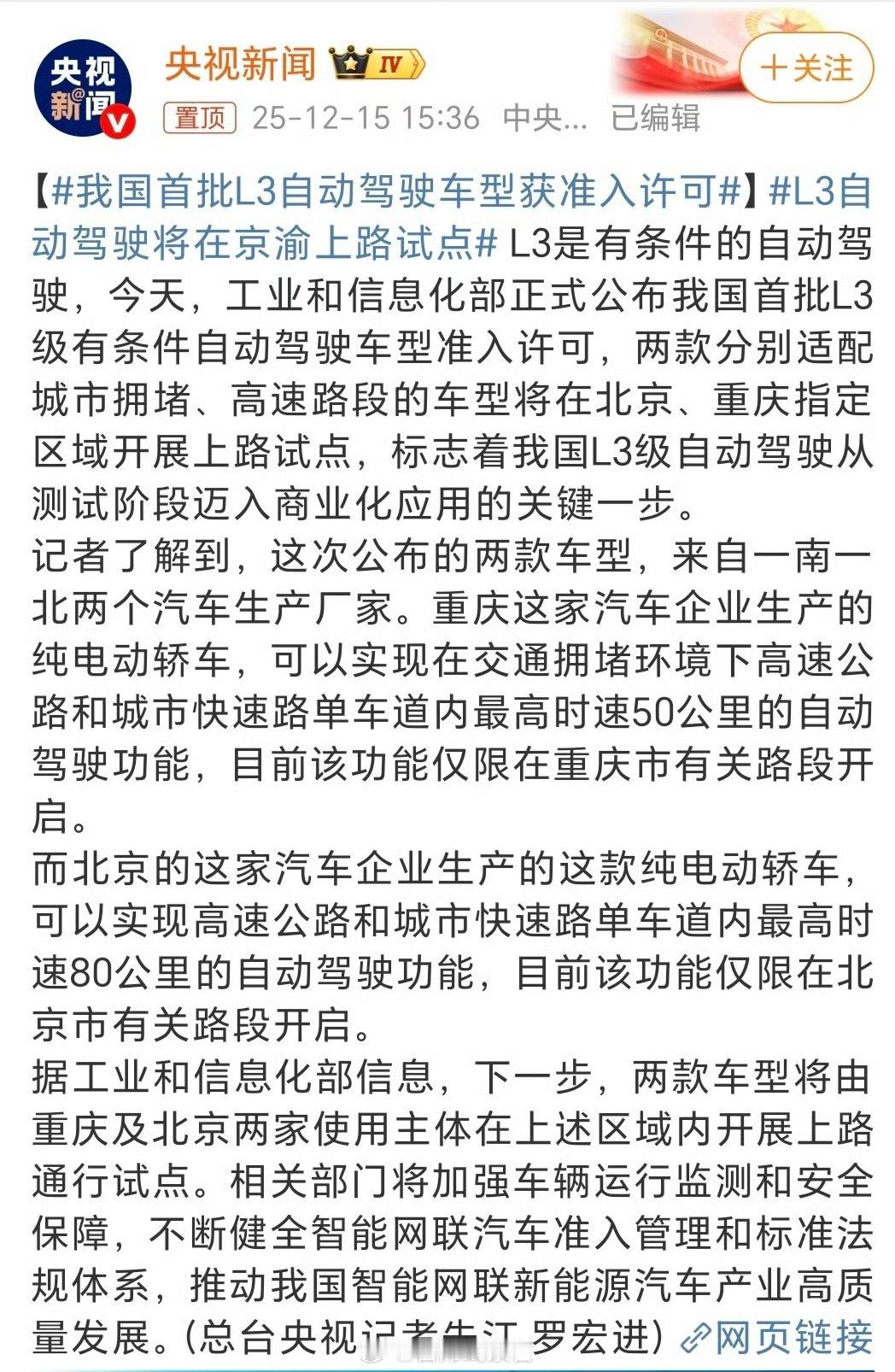 L3自动驾驶将在京渝上路试点工业和信息化部正式公布我国首批 L3 级有条件自动驾驶车型准入许可。两款分别适配城市拥堵、高速路段的车型将在北京、重庆指定区域开展上路试点。标志着我国 L3 级自动驾驶从测试阶段迈入商业化应用的关键一步。308_IO新能源汽车