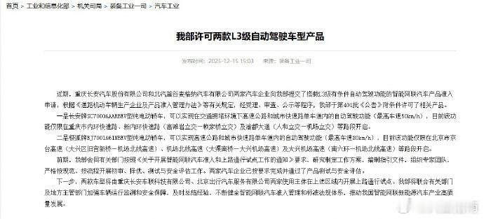工业和信息化部,正式公布我国首批L3级有条件自动驾驶车型准入许可,分别是重庆和北京,试点车型是长安和极狐主要是高速和城市快速路,城区还没开放我国首批L3自动驾驶车型获准入许可 大v聊车