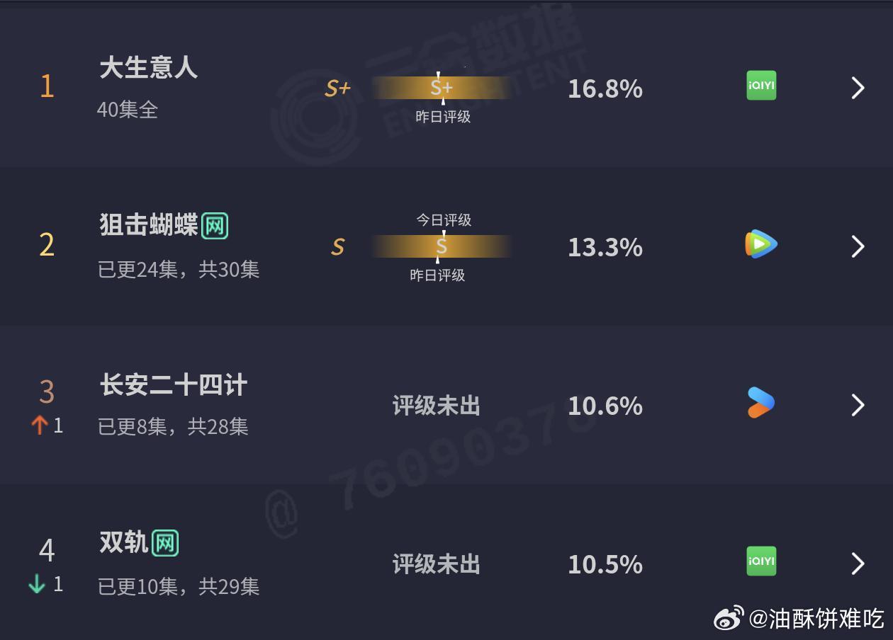 大生意人基本没什么声量但播放量目前在播剧第一,狙击蝴蝶是在播剧里声量最高的,切片做的太成功了设定好磕,虽然凑热闹的比追剧的人多但对男女主加成都不小
