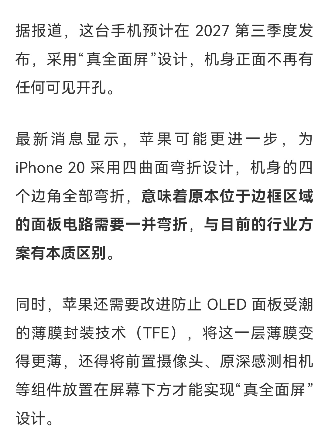 曝iPhone20搭载无开孔真全面屏苹果iPhone确实特立独行,华为旗舰今年都是平面直屏,苹果又准备搞四曲面了。主打一个叛逆,不过既然有无开孔真全面屏,我还是挺期待iPhone20的,希望能像iPhone X那样经典。