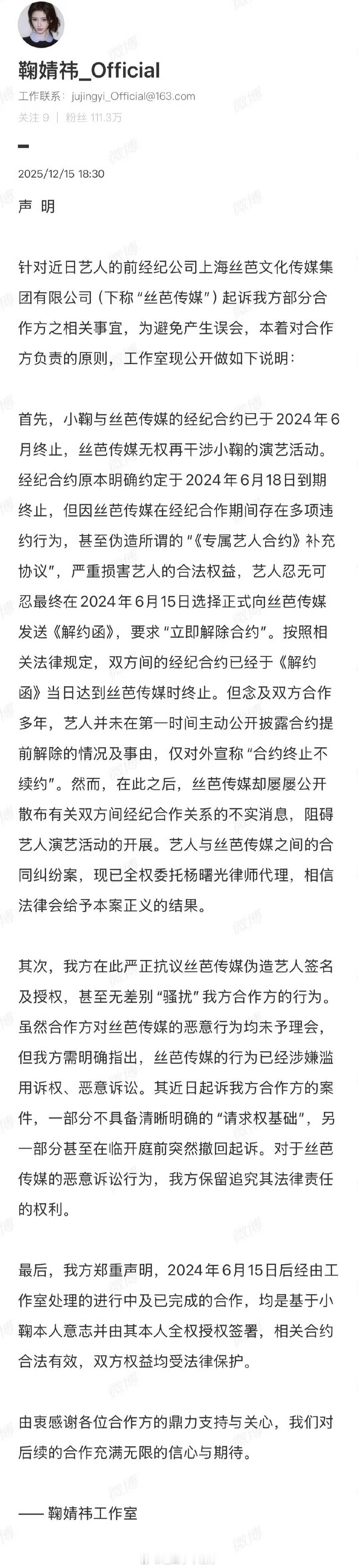鞠婧祎工作室发声明,说2024年6月18日合约到期,但丝芭伪造了补充协议,鞠婧祎忍无可忍发了解约函,体谅到和公司合作多年,没有揭老底,只是宣布到期不续约。