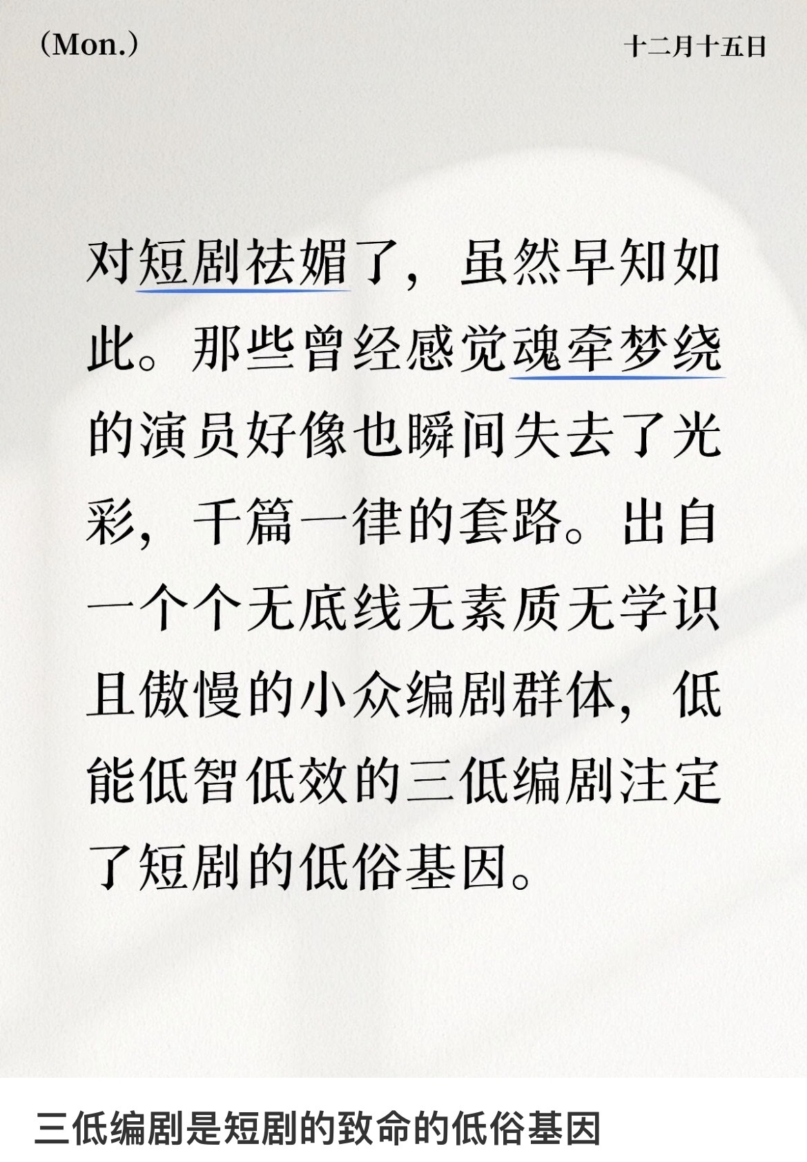 今天和一个短国制片聊她后悔把钱花在服化道上(因为没有妆造出圈),还不如花在投流上