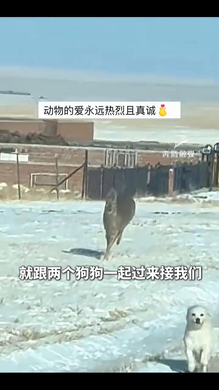 卓队被牧民喂养长大,每次主人回家都会跟着狗狗奔跑迎接,"动物的爱热烈且真诚"。 奔腾融媒。 12月14日(采访时间),内蒙古锡林郭勒盟。两个狗子来接你我就忍了,居然还有傻狍子来接。我家这个狍子是跟着棕色的狗一起长大的,每次回家就跟两个狗狗一起过来接我们。每次看到这三小只向我跑来的时候,我心里头都暖暖的。
