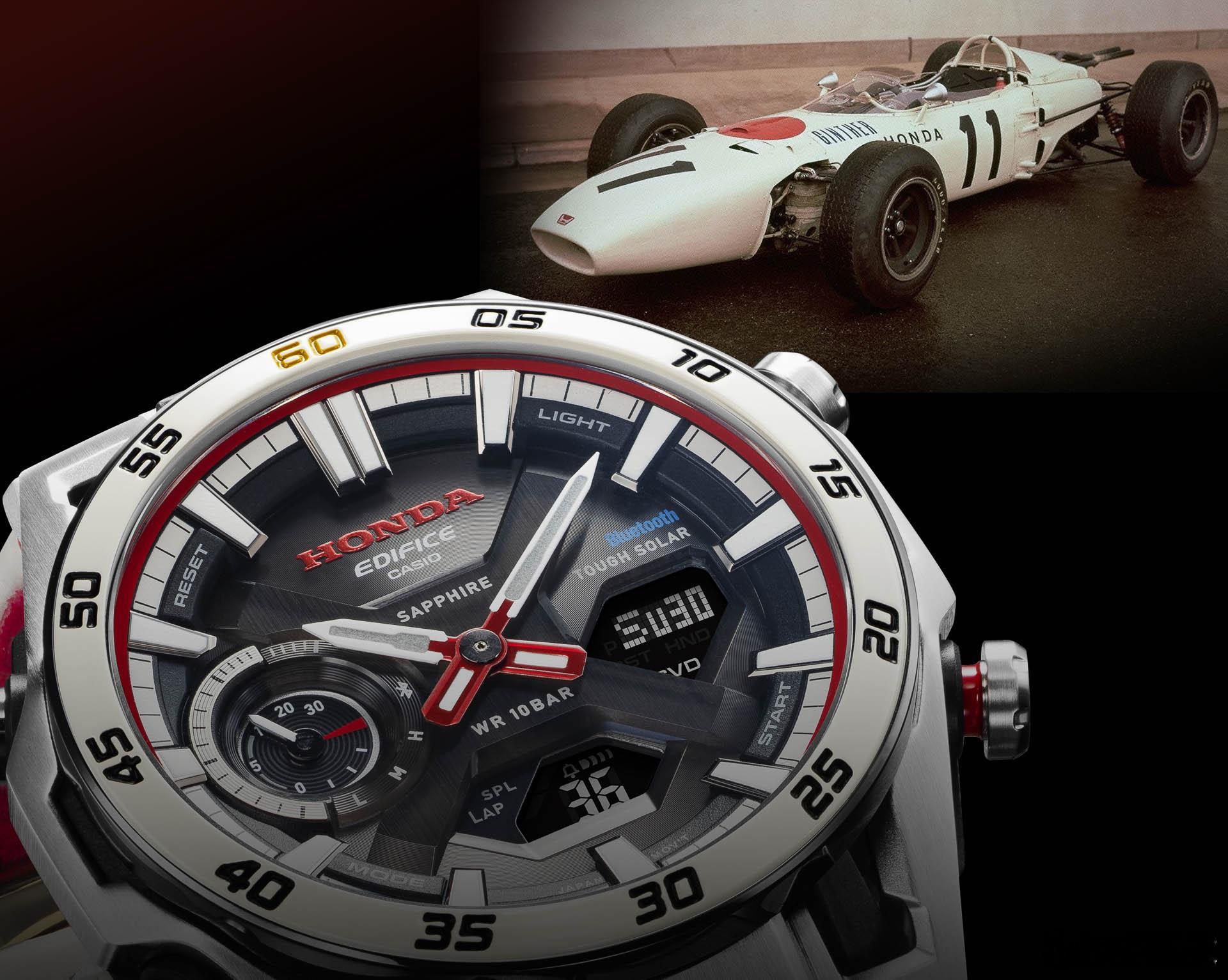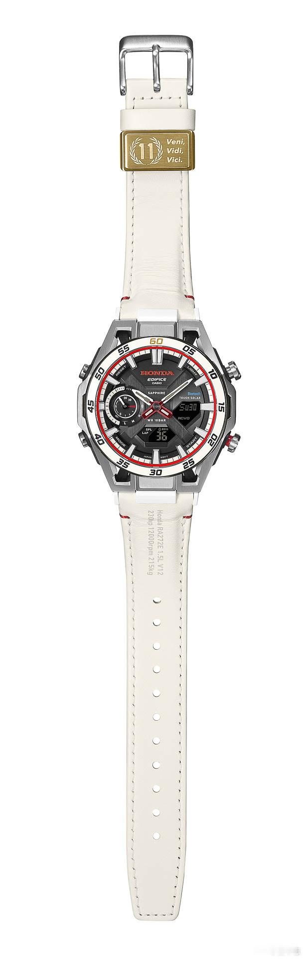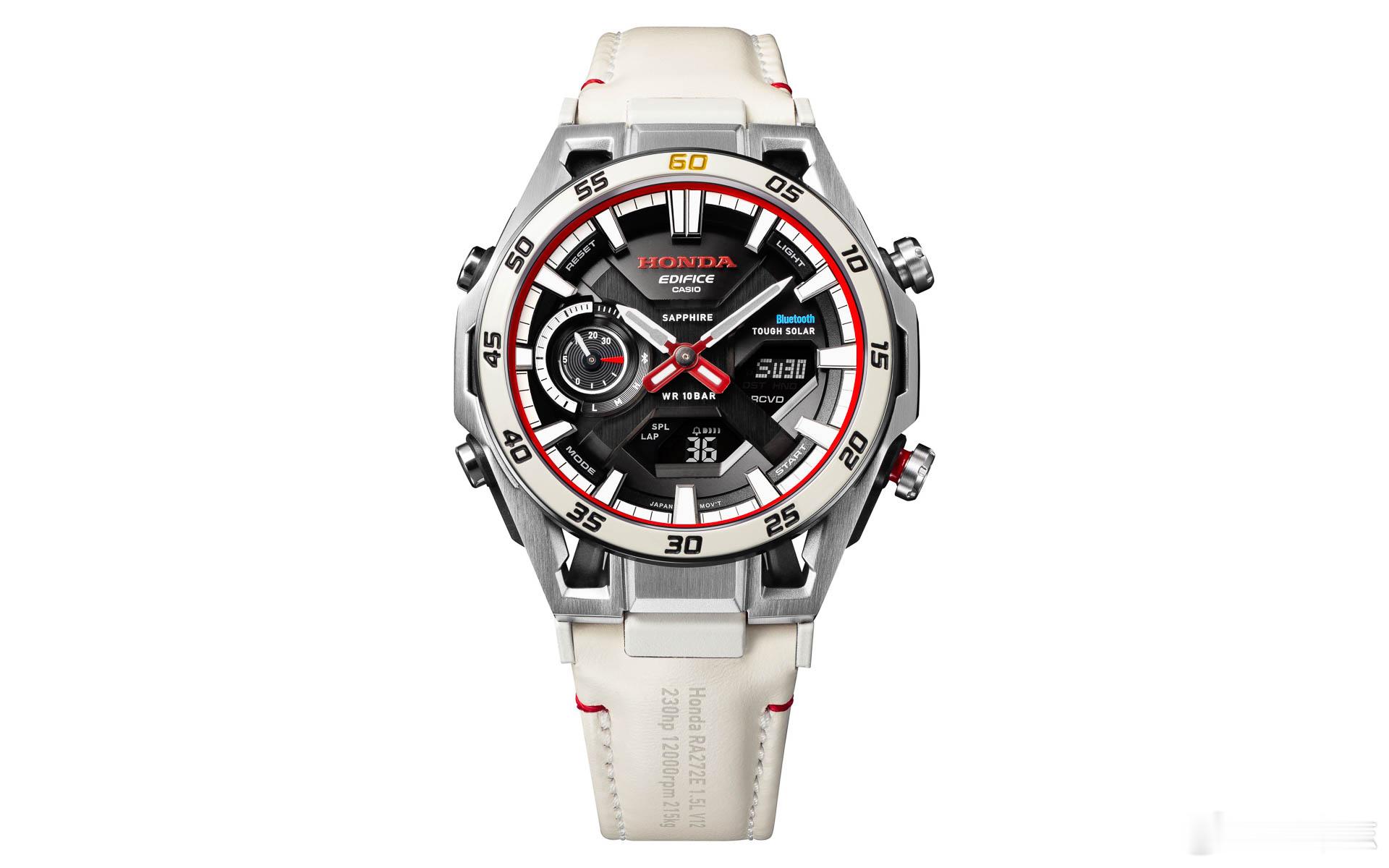 名车志玩乐 【纪念本田F1初冠60周年,卡西欧EDIFICE推出“冠军白”限量腕表】这款表从设计到细节,都充满了对本田传奇赛车RA272的致敬::表圈首次采用了与冠军赛车RA272车身相同的 “冠军白色”实车涂料;9点位置的小表盘设计灵感来源于赛车的转速表;带内侧印有当年那台“非常规”的V型12缸1.5升发动机的设计图;功能同样硬核:光动能 + 自动校时 + 世界时间等,2026年3月发售。