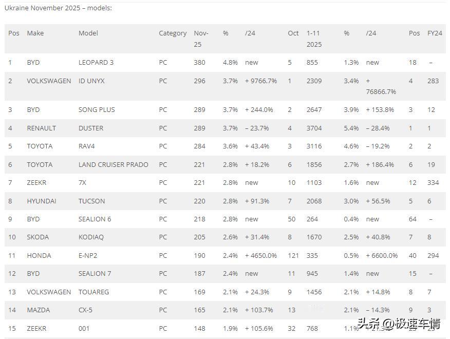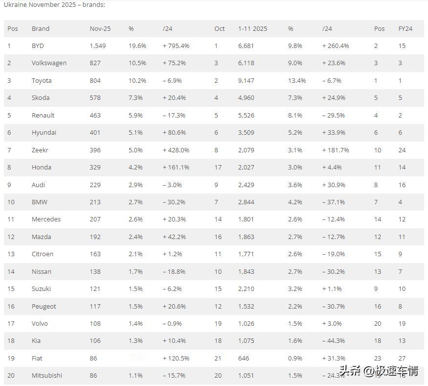 大家好,这里是极速车情。今天为大家带来乌克兰汽车市场11月份的销量数据报告。 11月,乌克兰车市迎来爆发式增长。比亚迪、极氪表现优异,中国多款车型成功跻身主流榜单。中国品牌的认可度持续提升中。 2025年11月,乌克兰新车销量同比大涨45.8%,至7910辆。 2025年1-11月,乌克兰累计销量同比增长0.9%,至68121辆。 中国品牌表现:比亚迪以1549辆,19.6%份额登顶当月品牌榜,增速近 8 倍,成为市场绝对焦点。 极氪396辆,实现跨越式增长,以 396 辆销量、5% 份额跻身第七,创下该品牌全球最佳市场表现。 奇瑞:73辆。 小米:52辆。 捷途:41辆。 腾势:40辆。 名爵:36辆。 阿维塔:26辆。 吉利:13辆。 小鹏:12辆。 Maxus:7辆。 江淮:5辆。 长城:4辆。 雷达:4辆。 长安:3辆。 东风:3辆。 零跑:2辆。 理想:2辆。 智界:2辆。 领克:2辆。 问界:1辆。