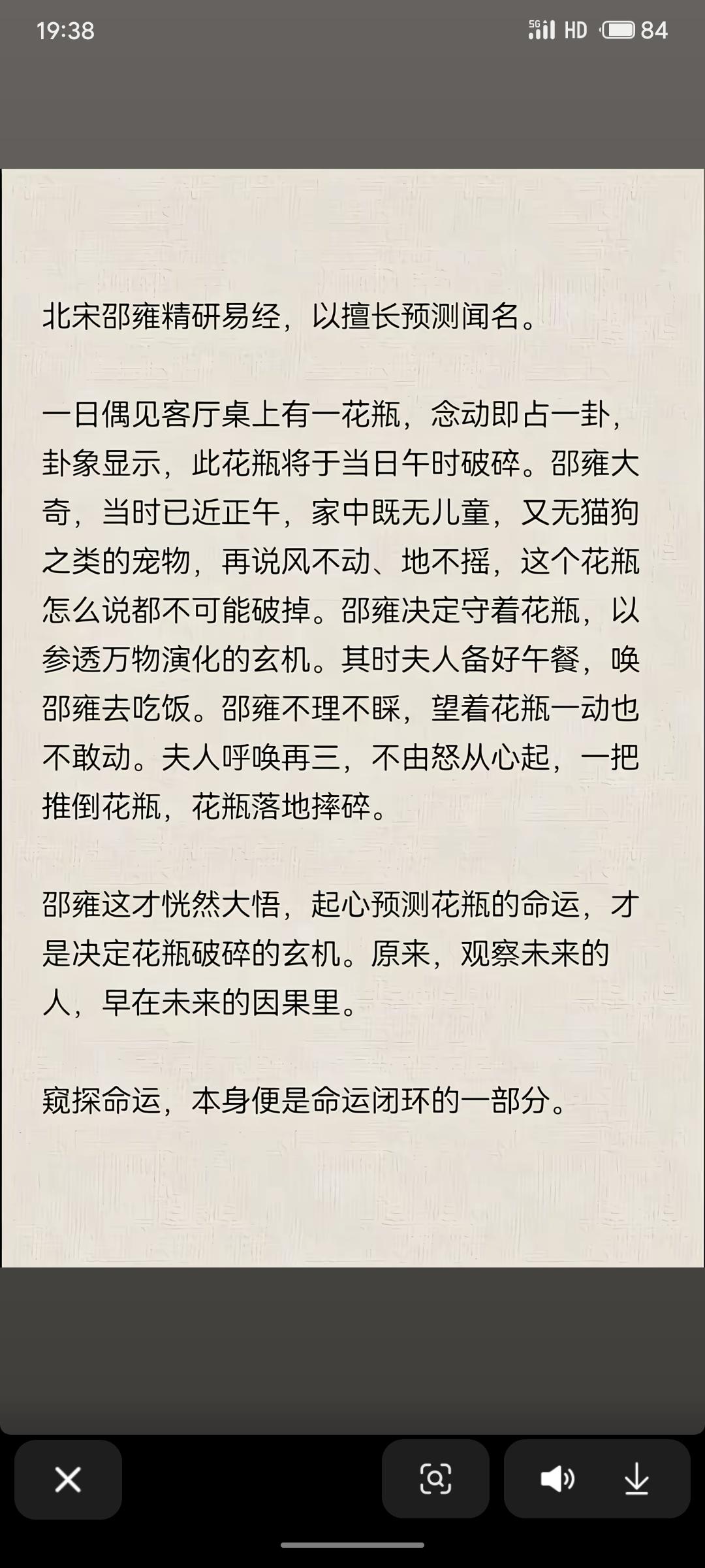北宋学者邵雍占卜出家中花瓶将在午时破碎。他决意守候以防不测,却因专注不理夫人呼唤,反令夫人怒而推倒花瓶。邵雍由此悟出:窥探命运的行为本身,已是命运实现的一环。