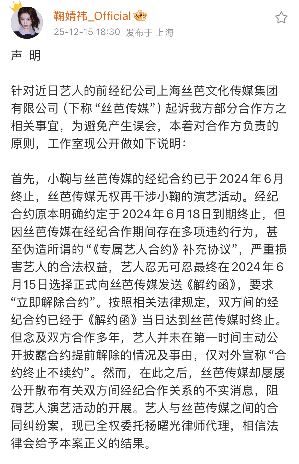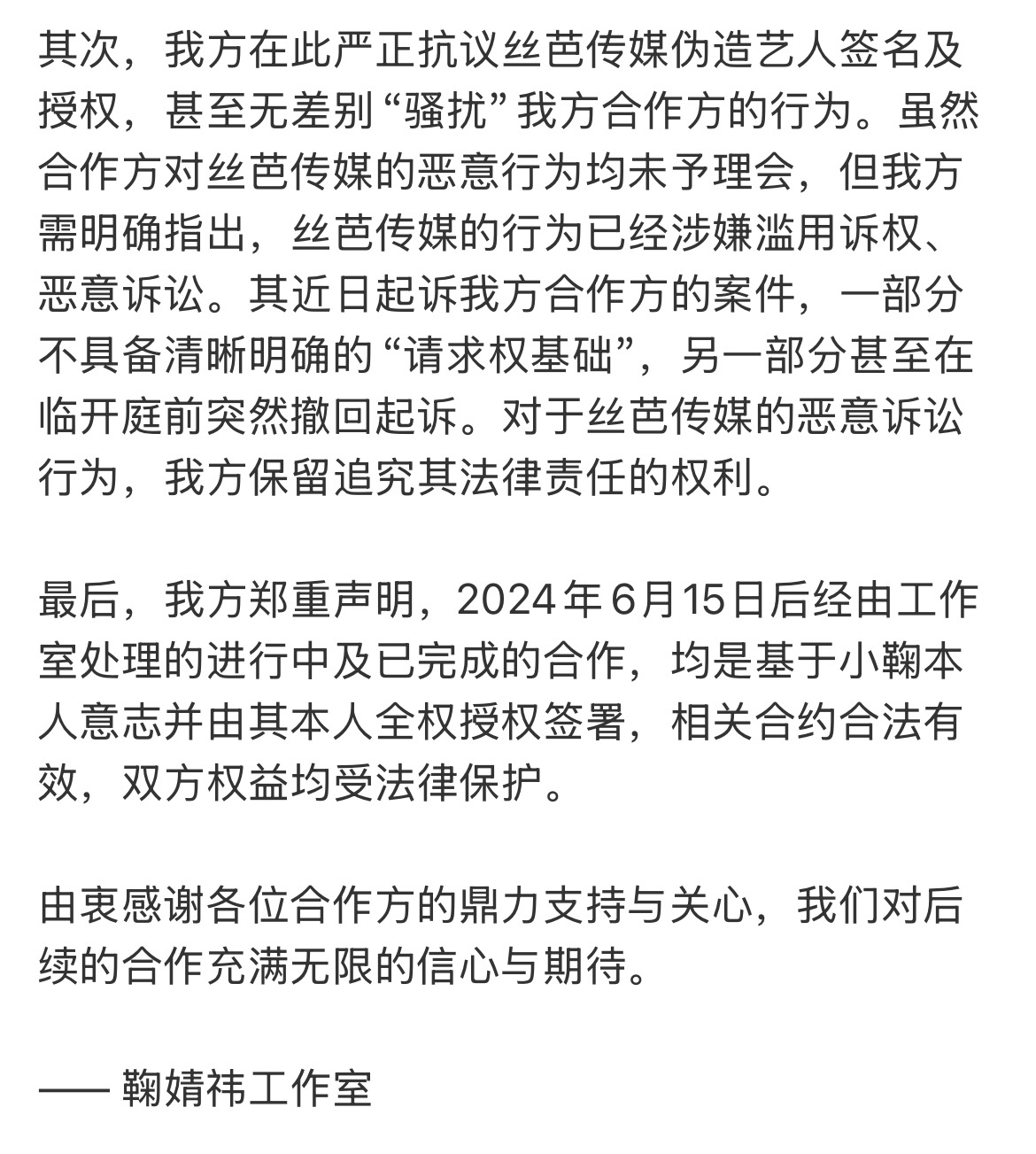 鞠婧祎工作室发文向丝芭维权 鞠婧祎工作室发文怒斥丝芭传媒具体纠纷如下:1.鞠婧祎与丝芭传媒在24年6月终止合同,这之后丝芭却屡屡公开散布有关双方间经纪合作关系的不实消息,阻碍艺人演艺活动的开展。2.丝芭传媒伪造艺人签名及授权,无差别骚扰鞠婧祎合作方。丝芭传媒的行为已经涉嫌滥用诉权、恶意诉讼。