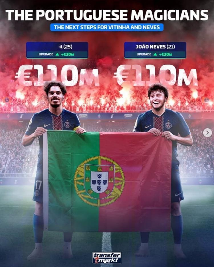 C罗要圆梦世界杯封神了了,大巴黎的葡萄牙中场双核身价均破亿! 刚刚,《德国转会市场》公布了法甲球员最新身价,其中效力于巴黎的葡萄牙中场双核维蒂尼亚和 若昂·内维斯的身价均上涨2000万欧元,来到了1.1亿欧元,并列成为法甲身价最高的球员。 25岁的维蒂尼亚本赛季为巴黎出战26场比赛贡献了6球10助攻的数据、21岁的若昂·内维斯本赛季为巴黎出战了20场比赛贡献了8球3助攻的数据,两人是上赛季巴黎能拿到欧冠冠军的绝对核心,现在已经成长为世界级顶级中场了。 C罗真的是生不逢时啊,巅峰时期没有等到葡萄牙顶级中场,现在马上退役了却迎来了维蒂尼亚和 若昂·内维斯,不过明年的世界杯,有维蒂尼亚和若昂·内维斯的葡萄牙绝对是夺冠大热门,C罗有很大的希望圆梦世界杯封神了。