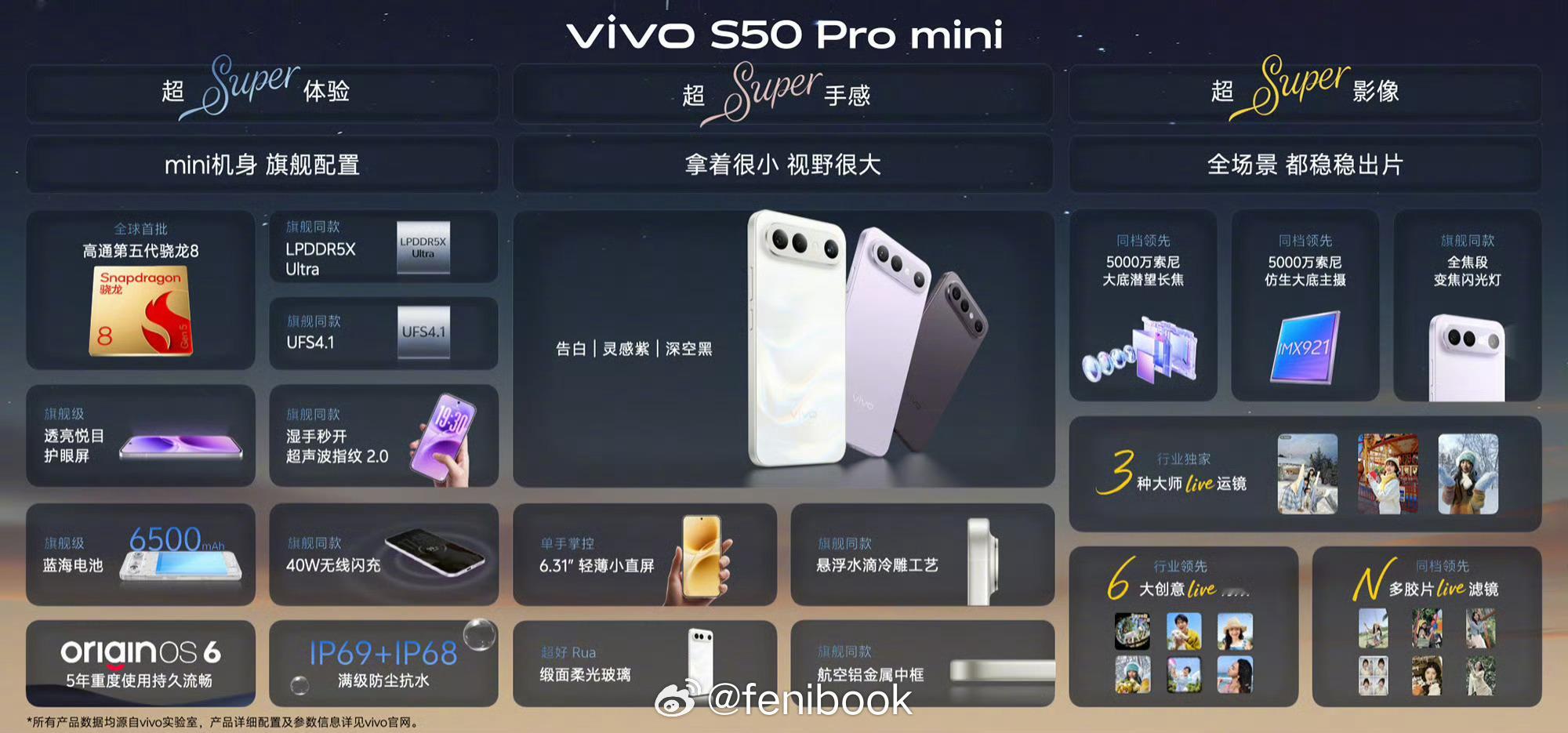 vivo S50 Pro mini价格来了,3699起,配置比前代全面提升,而且还加入了无线充电,并且是下半年唯一骁龙8 Gen5小屏机,这价格小伙伴们觉得如何?另外,全系标配超声波指纹,标准版也是