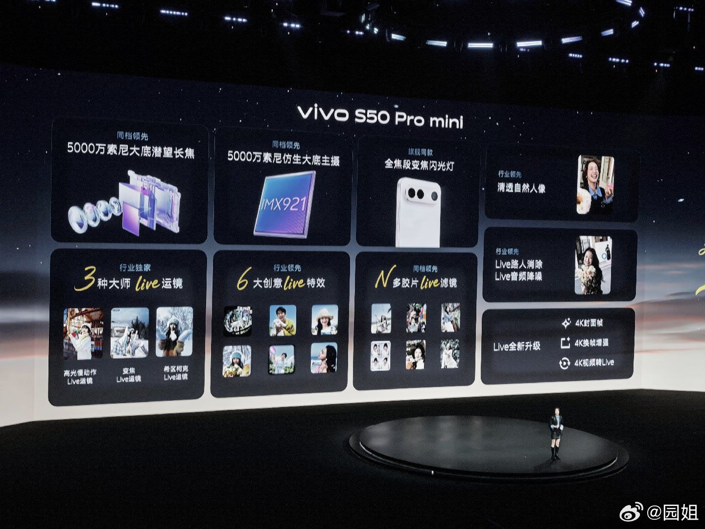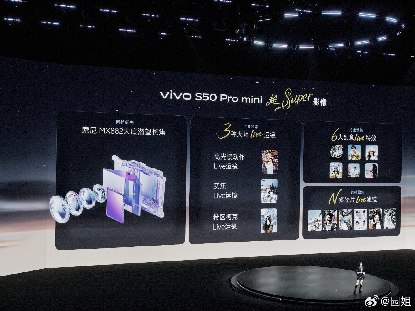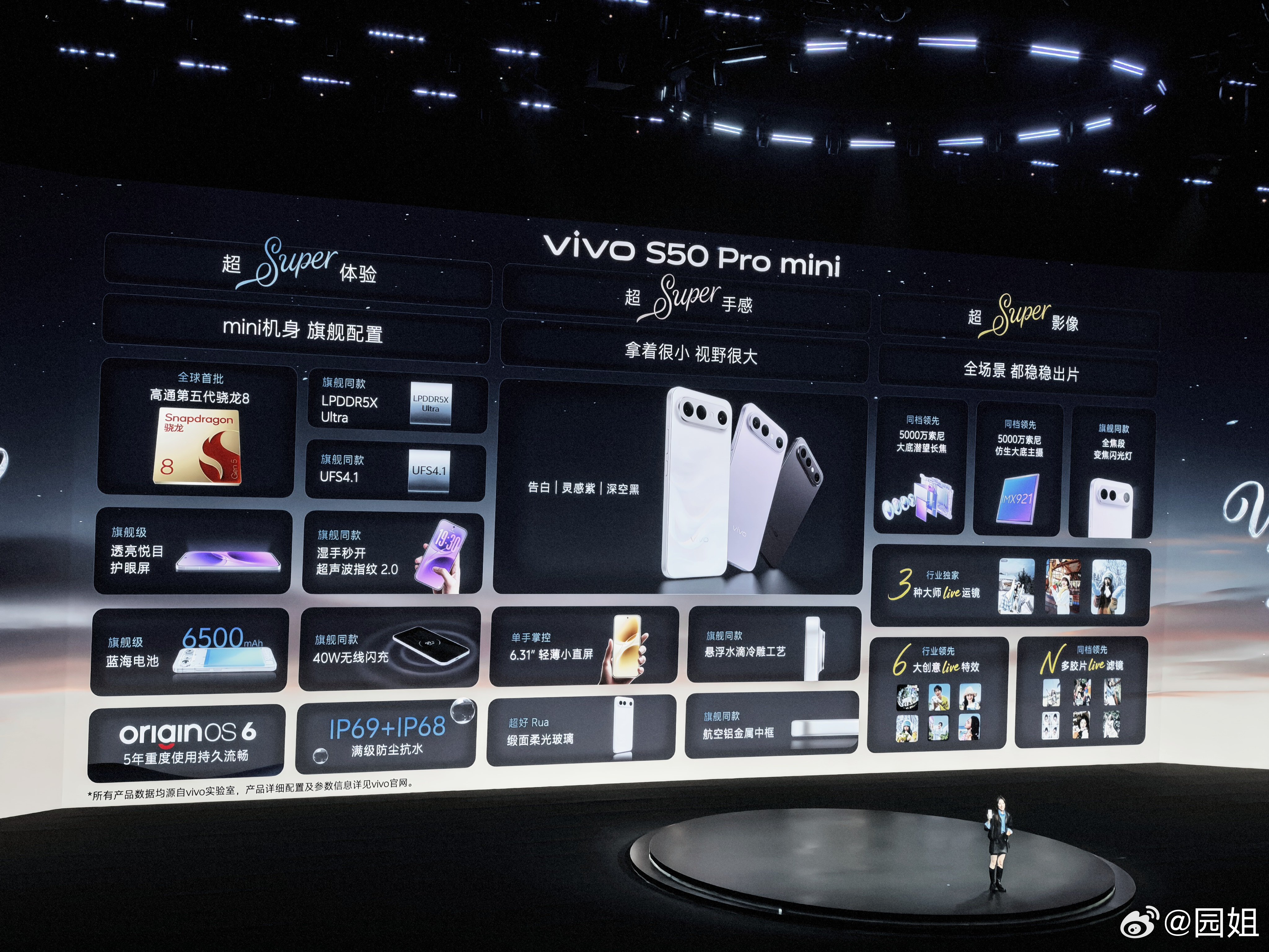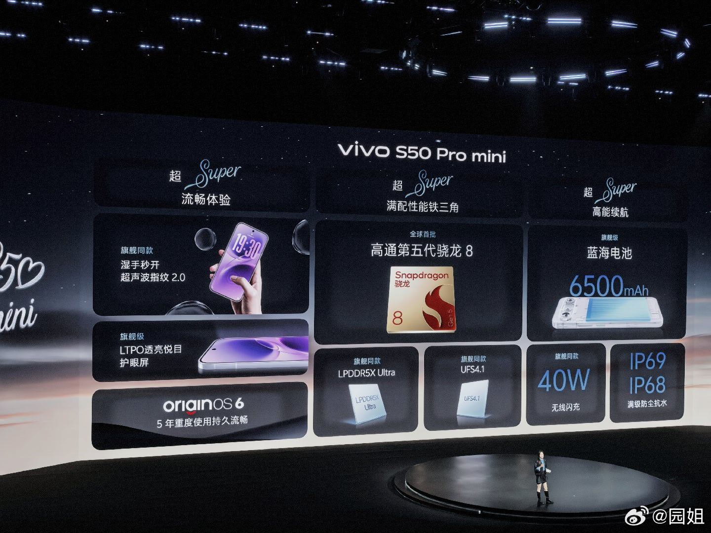 vivo S50 Pro mini 屏幕 6.31 英寸,6500mAh 电池,支持 90W 有线快充+ 40W 无线充芯片方面骁龙 8 Gen5 + LPDDR5X Ultra + UFS4.1是不是还不错。影像方面呢后置 50MP IMX921 主摄、 IMX882 潜望长焦,前置 50MP。