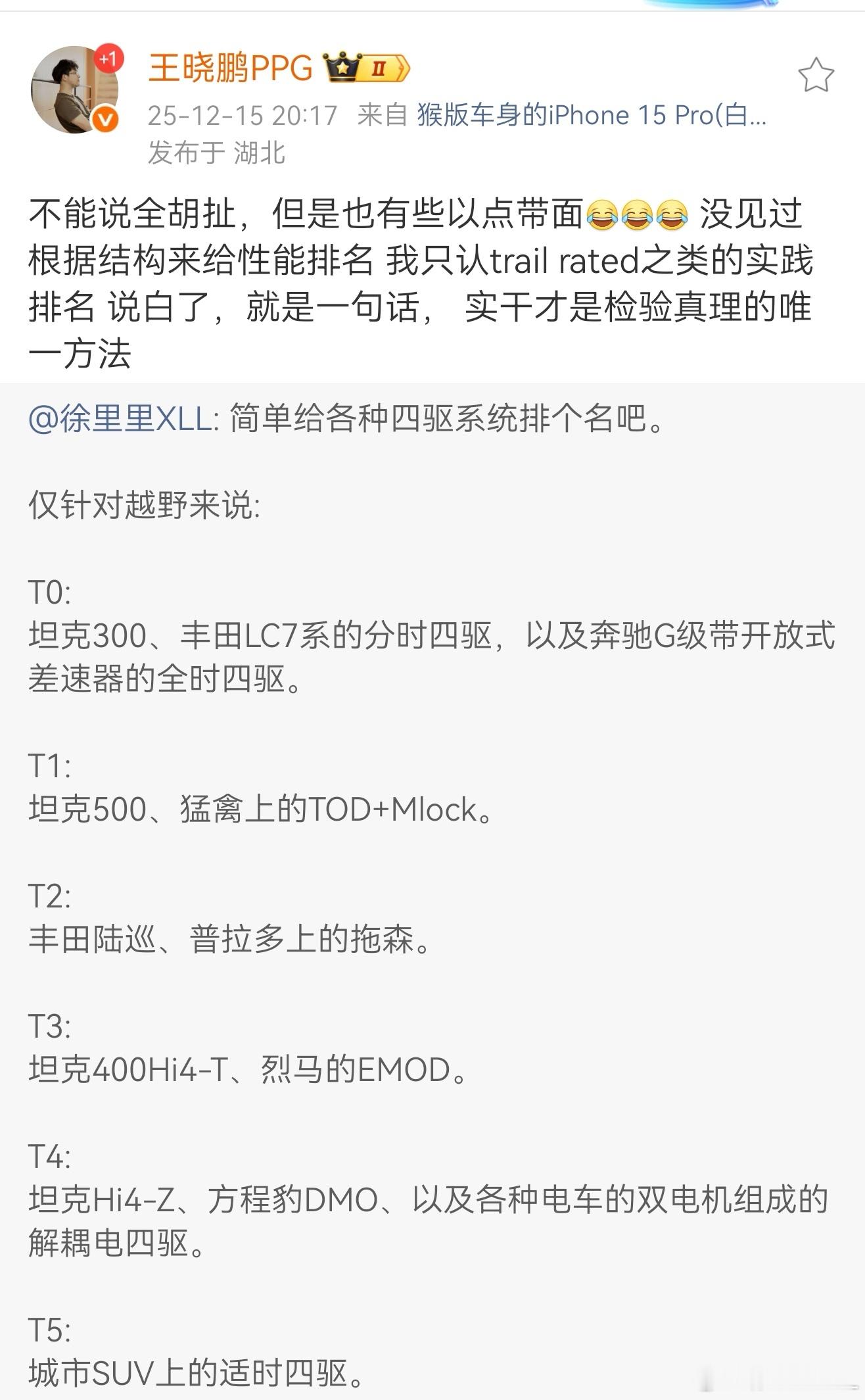 四驱这么简单的东西,不根据结构根据啥?分时四驱就是最简单的东西。几个铁疙瘩啮合在一起,四轮绝对同步,承载上限就取决于金属的强度。解耦电四驱玩出花来他也变不出中央差速锁。结构不仅决定了下限,同时也决定了上限。比如分时四驱这种纯硬派越野用的东西,连调校的空间都没有。Trail Rated更多的是对具体车型的评价。一台车的越野能力是受多种因素影响的,除四驱系统外,还有动力总成、整备质量、悬架结构、接近角离去角、轮胎等等。我说的不是“四驱”这个东西吗?