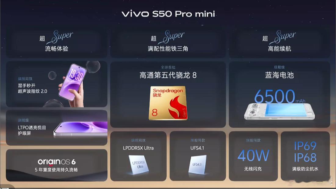 vivo S50 Pro mini尺寸mini,但性能一点都不mini第五代骁龙8、LPDDR5XUltra、UFS4.16500mAh大电池,40W无线快充超声波指纹