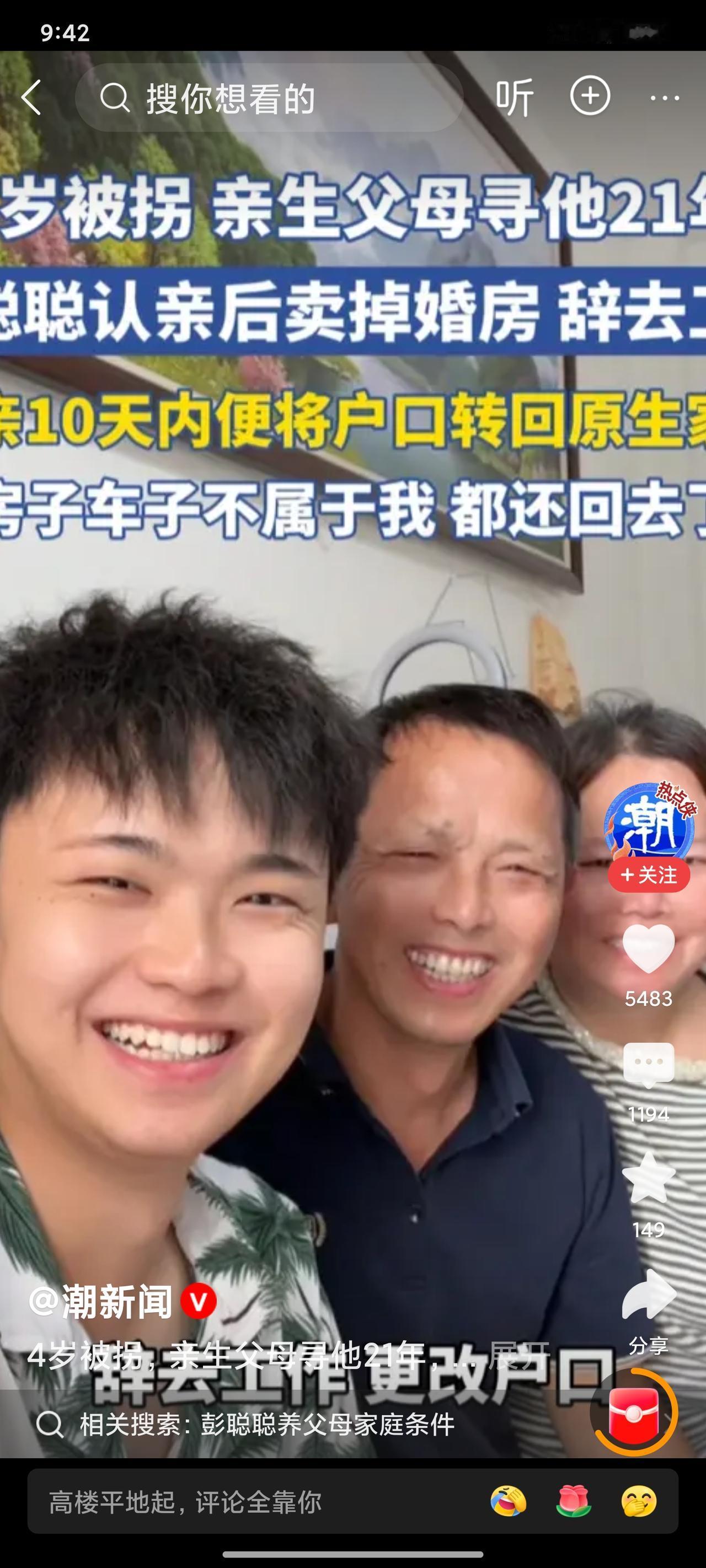 被拐21年男子辞职卖房回归亲生父母 被拐21年的彭聪聪,认亲后的一连串举动令人直呼“太清醒”——当场注销养父母家户口,迅速迁回亲生父母名下,辞去工作,卖掉自己精心装修的婚房,连车带房一并还给养家,干干净净回归原生家庭! “那些车房是给他们亲生孩子的,我不是,自然不能要。”彭聪聪言辞铿锵。 他心里透亮,养父母给予的物质条件再好,也比不上亲生父母21年寻亲的锥心之痛。为了找寻他,亲爸亲妈跑遍大江南北,青丝熬成白发,积蓄花得一干二净,原本美满的家庭支离破碎,这份跨越二十多年的牵挂,他怎会不珍视? 反观现实,不少寻亲家庭盼来团圆,孩子却因习惯了养家的生活、舍不得现有的优渥条件,选择留在养家;更有甚者,还埋怨亲生父母“弄丢自己”,让老人抱憾终生。 而彭聪聪以实际行动证明:血缘亲情才是最坚不可摧的纽带,他要做的,便是用余生弥补亲生父母的遗憾。 不过评论区也炸开了锅: 有人大力支持:“这才是真汉子!拐来的‘家’本就名不正言不顺,把不属于自己的东西归还,才能光明正大地做亲爸妈的孩子!” 也有人质疑:“养了21年,说断就断,是不是太绝情了?养父母的养育之恩难道就一笔勾销了?” 还有网友感同身受:“换作是我也会选亲爸妈!21年的寻亲路有多艰辛,只有当事人清楚,这份骨肉亲情无可取代!” 彭聪聪并非无情,而是深知亲生父母的心酸。 养父母的养育或许有所付出,但这份付出是建立在亲生父母的痛苦之上。他以“净身出户”的决绝,回应着亲生父母二十多年的牵挂与期盼。 你支持彭聪聪的选择吗? 快来评论区说说你的看法~