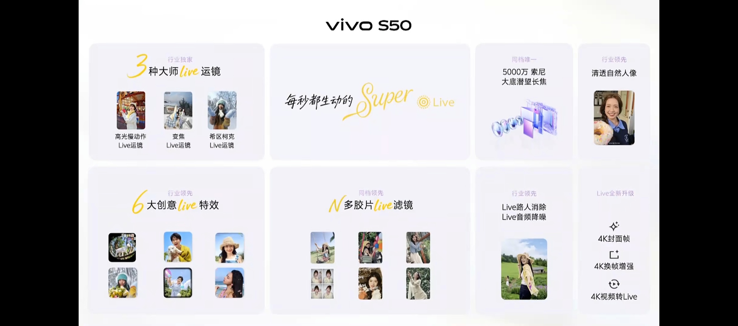 vivo S50的核心配置:第三代骁龙8s芯片,搭配旗舰级LPDDR5X运存和UFS4.1存储,组成满配性能铁三角;AI电竞信号引擎2.0。超声波指纹解锁2.0。清透悦目护眼屏,支持硬件1nit超低亮度;搭配4320Hz防频闪PWM调光和硬件级低蓝光技术。IP69+IP68防水,立体双扬,三麦克风以及6500mAh电池。vivo S50