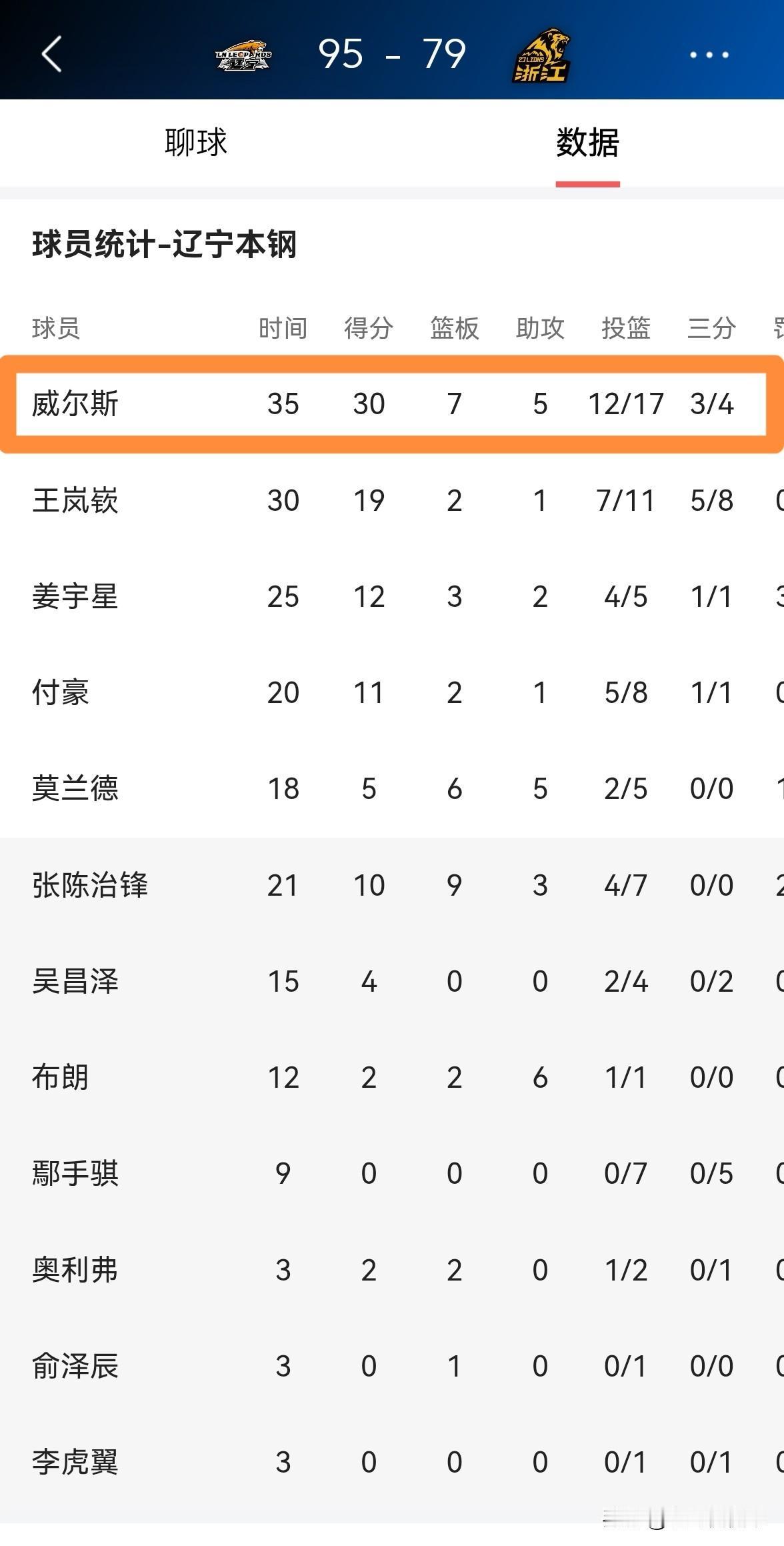 辽宁本钢外援威尔斯不愧是当今CBA最强外援之一!在今天辽宁本钢主场以95:79大胜浙江方兴渡的比赛中,威尔斯将自己超强的得分能力展现的淋漓尽致。 全场比赛下来,威尔斯首发出战35分钟,投篮17中12,其中三分球4中3、罚球5中3轻松砍下30分7篮板5助攻1盖帽,他的场上正负值为全队最高的+22。 本场比赛,威尔斯在和浙江方兴渡外援布朗的对决中取得了完胜,威尔斯把布朗打得屁滚尿流。