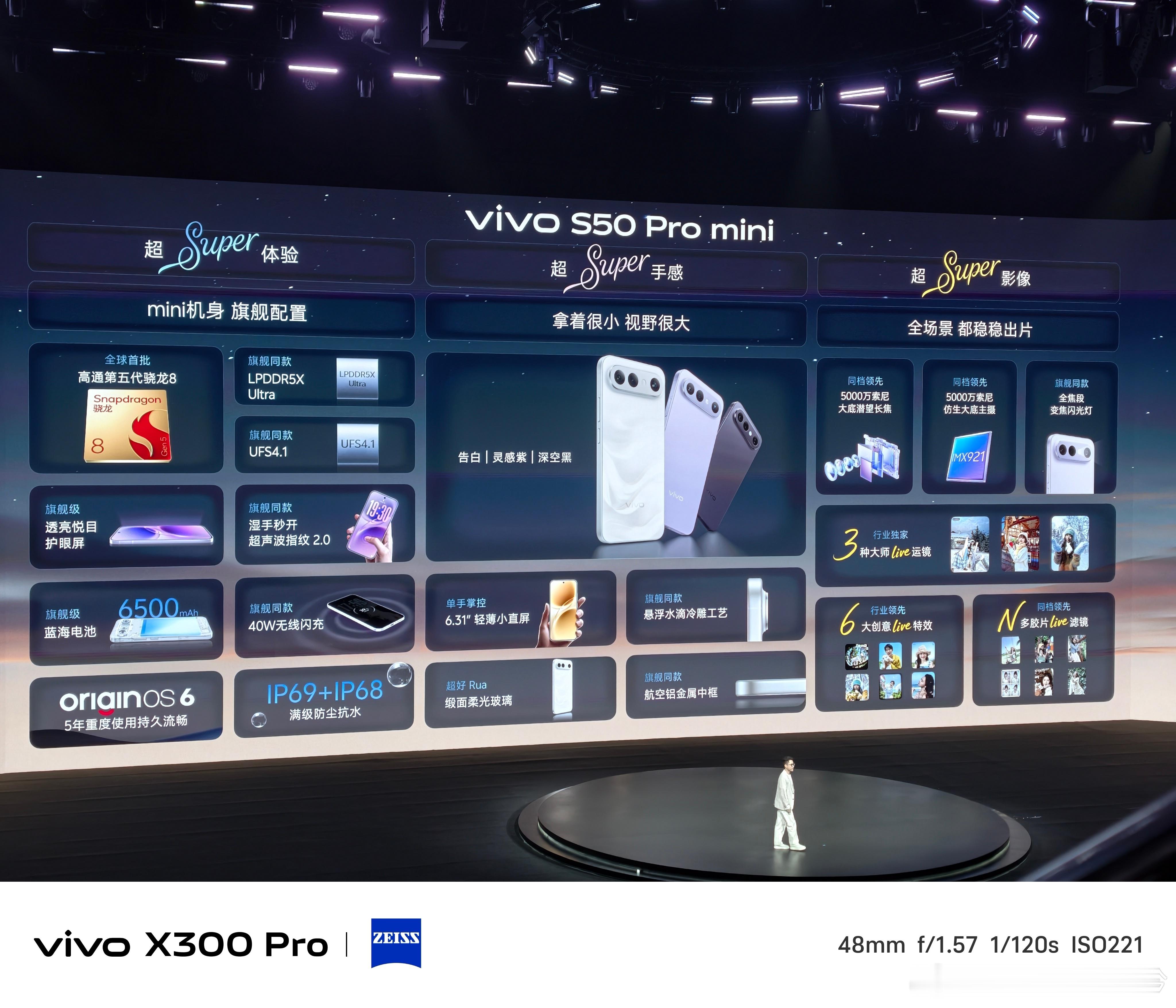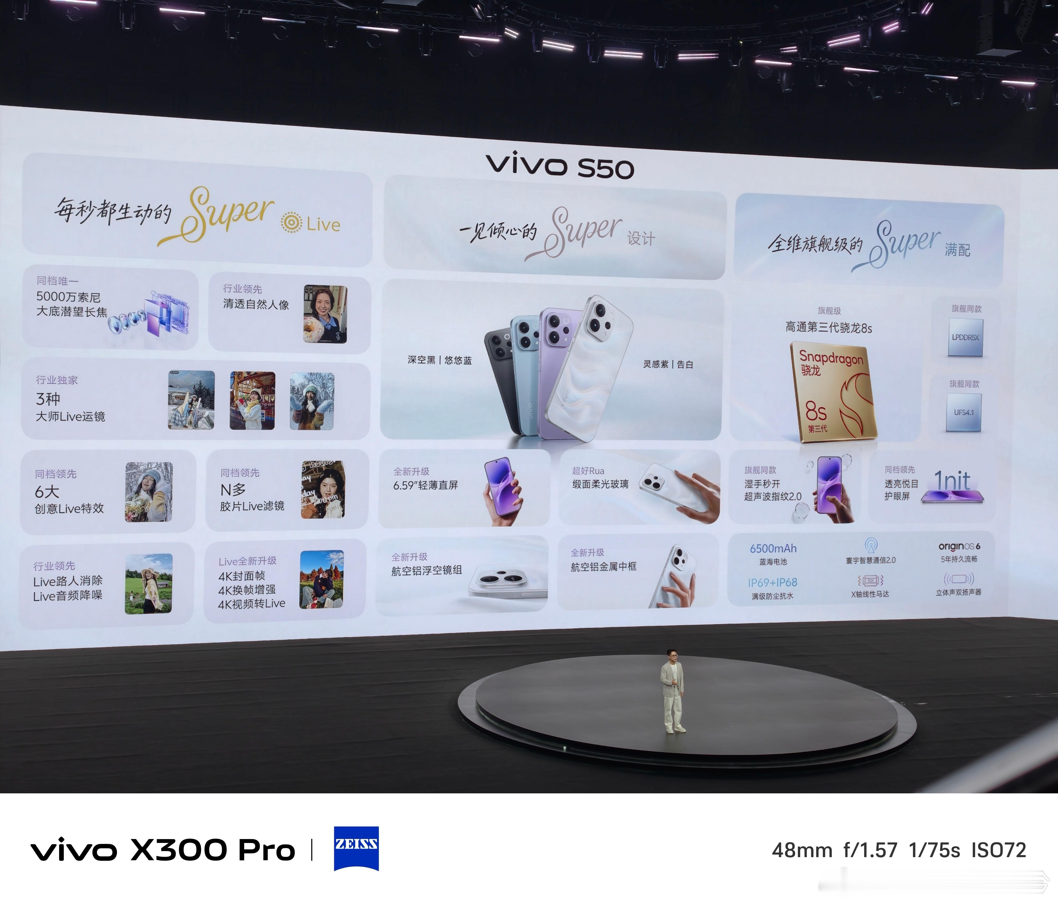 今天的vivo S50系列来给大家总结一下啦vivo S50【设计】深空黑/悠悠蓝/灵感紫/告白缎面柔光玻璃+最薄7.49mm趣味光栅壁纸+文字宣言壁纸+田曦薇定制主题【Live】长焦Live——5000万 IMX882潜望长焦4K封面帧——换封面帧智能计算成4KLive运镜——变焦Live、高光慢动作Live、希区柯克运镜LiveLive路人消除、Live调音、Live特效【配置】性能——骁龙8sGen3+LPDDR5X+UFS4.1屏幕——1nit最低亮度、4320HzPWM调光、5000nits峰值亮度学习三件套——录音机实时转写、表情文档、vivo办公套件续航——6500mAh电池、90W闪充vivo S50 Pro mimi【设计】6.31英寸屏幕全新镜组设计告白/灵感紫/深空黑【配置】骁龙8Gen5+LPDDR5X Ultra+UFS4.1续航——6500mAh+40W无线闪充+反向充电【影像】5000万像素IMX921主摄+5000万像素潜望长焦CIPA4.5防抖全焦段变焦闪光灯【售价】vivo S5012+256GB,299912+512GB,329916+512GB,3599vivo S50 Pro Mini12+256GB,369912+512GB,399916+512GB,4299
