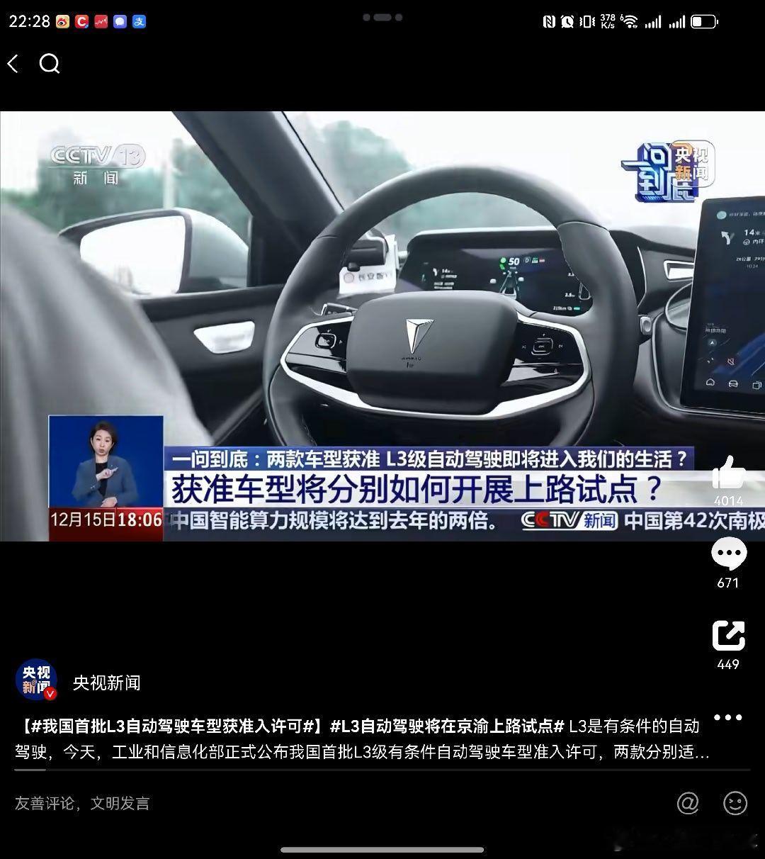 我国首批L3自动驾驶车型获准入许可 工信部在做相关的准入许可,依旧考虑了方方面面。重点总结很简单,几个关键信息:1️⃣一南一北两家,分别是深蓝和极狐。2️⃣背后的车企是长安和北汽。都是国资。3️⃣智驾方案,背后都有H的影子。4️⃣另外新闻要结合起来连连看,在去年2024年的6月份,工信部曾经发过一个《四部门有序开展智能网联汽车准入和上路通行试点》通知,当时是有9家联合体入围了的。那么这一次深蓝和极狐就成为了率先吃螃蟹的两家。北京和重庆也成为了最开始试点L3的城市。这一次要说比较遗憾的是,没有萝卜快跑率先落地的武汉肯定是首当其冲的。大v聊车