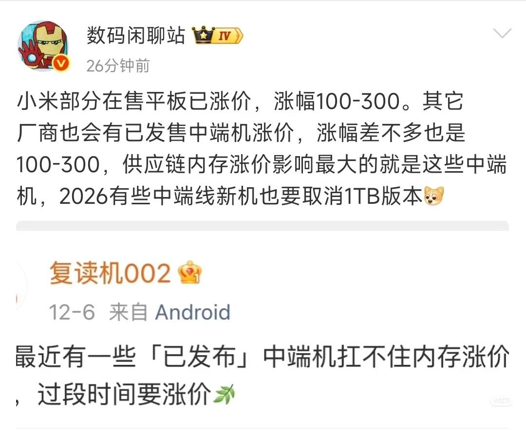 小米多款平板涨价受存储芯片价格暴涨,在售机型突然涨价100-300元!其中小米Pad 8系列涨价100元,红米Pad 2全系涨价200元,友商也快了!