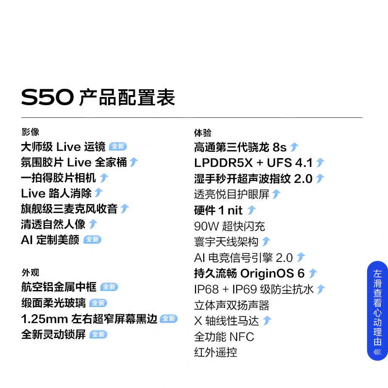数码闲聊站 vivo S50正式发布,2999元起!1.处理器:高通骁龙8s Gen3+LPDDR5X+ UFS 4.1 !2.屏幕:6.59寸1.5K直屏,120Hz刷新率,硬件1nit超低亮度!3.影像:前置5000w,后置5000w主摄+5000w潜望长焦+800w超广角!4.续航:6500mAh+90w快充!5.其他:OriginOS 6,IP68/69防尘防水,红外、NFC、立体声双扬声器,X轴线性马达,VC液冷散热,超声波指纹,寰宇天线架构,告白、幽幽蓝、灵感紫、深空黑四色可选,12+256GB 2999元起!