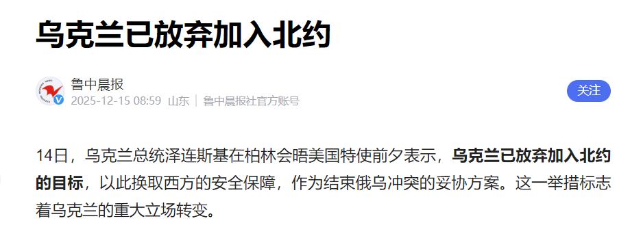 快报,快报!乌克兰总统泽连斯基正式宣布了 2025 年 12 月 14 日,乌克兰总统泽连斯基宣布,乌克兰已放弃加入北约的目标,希望以此换取西方的安全保障,作为结束俄乌冲突的妥协方案。 谁能想到,三年前还喊着 “战斗到最后一人” 的泽连斯基,如今会主动放下入约这个 “执念”?说到底,是战争的代价实在太惨重,乌克兰已经扛不住了。 战前乌克兰有 4300 万人口,现在有效控制区里只剩不到 3000 万,1000 多万人要么逃到国外当难民,要么留在俄方控制区,要么永远倒在了战场上。泽连斯基自己都承认,军队死伤超 40 万,西方智库估算的数字更高,快到七十万了,这意味着每个乌克兰家庭几乎都有亲人伤亡或失踪。 20 到 39 岁的青壮年男性只剩三百多万,既要扛枪打仗,又要撑起残破的家园,街头抓人当兵、边境堵逃兵的事早就不新鲜,有些月份逃兵案件直接突破 2 万起。 经济上更是惨不忍睹,俄罗斯现在控制着乌克兰近五分之一的土地,面积差不多 12 万平方公里,全是好地方 —— 顿巴斯的煤矿、扎波罗热的核电站、赫尔松的粮食产区,还有黑海沿岸的重要港口,这些地方战前贡献了乌克兰 40% 的 GDP,现在全没了。 基础设施被炸得稀烂,农田荒芜,工业停滞,外债早就突破 1900 亿美元,而全年 GDP 还不到 1700 亿美元,早就资不抵债,从 2024 年 8 月就停了所有外债偿还。 为了换援助,乌克兰还把稀土、锂矿这些关键矿产的开采权,打包交给西方资本,美资公司拿走 70% 以上的利润,一签就是 50 年,等于把国家未来几十年的生路都押出去了。 更要命的是,西方的援助说断就断,乌克兰的 “靠山” 靠不住了。美国之前承诺的援助,实际到乌克兰手里的也就 760 亿美元,其余大多用来补充自己的军火库存。 2025 年特朗普政府上台后,直接暂停了军事援助和情报支持,还逼着乌克兰接受 “28 点和平计划”,明确说北约不再扩张,不让乌克兰入约。 欧洲这边也撑不下去了,截至 2025 年 10 月,欧盟对乌援助超 800 亿欧元,光难民安置就花了 230 亿欧元,自己都被能源危机和难民问题搞得焦头烂额,弹药供应直接削减了 30%。 2025 年下半年,乌克兰收到的军事援助大幅下降,7 到 10 月欧洲只凑了不到 80 亿欧元,连上半年的一半都不到,乌军炮弹发射量降到俄军的五分之一,装甲部队出动率只剩 22%,有些士兵甚至用纸板填防弹衣,这样的仗怎么打? 泽连斯基放弃入约,其实是学了历史上的成功先例,1955 年奥地利就是这么做的。当年二战结束后,奥地利被美苏英法四国占领,处境和现在的乌克兰有点像。 后来奥地利宣布永久中立,不加入任何军事同盟,四国也承诺保障它的领土完整和安全,最后所有外国军队都撤了,奥地利从此过上了和平日子,经济慢慢复苏,成了欧洲最宜居的国家之一。 泽连斯基就是想复制这种模式,用放弃入约这个俄罗斯最在意的条件,换西方的 “类北约第五条” 安全保障,希望美国、欧盟这些国家能像北约成员国那样,在乌克兰遇到危险时出手相助,而且这个保障得有法律约束力,不是口头说说。 俄罗斯这边也早就亮明了底线,阻止北约东扩是他们发动特别军事行动的核心目标,乌克兰入约就是他们不能碰的红线。现在乌克兰主动放弃,等于解开了双方矛盾的死结,为和谈创造了最关键的条件。 克里姆林宫虽然对西方的安全保障还有怀疑,但也承认这个表态是积极的,只要后续能落实领土划分、裁军这些关键条款,和平协议就有希望达成。 可能有人会说,这是乌克兰认输了,丢了尊严。但对老百姓来说,尊严哪有和平重要?没了命,没了家,再硬的骨气也撑不起一个国家。 看看那些逃到波兰、德国的难民,富裕人家还能靠存款维持生活,普通老百姓只能打零工糊口,70% 的中小企业主、65% 的 IT 从业者都跑了,乌克兰的 “造血能力” 都被掏空了。再打下去,恐怕连国家都要从地图上消失,到时候谈何尊严? 泽连斯基的这个决定,是他从 “理想” 回到 “现实” 的清醒选择。他终于明白,北约不会真的为了乌克兰和俄罗斯开战,西方援助也不是无底洞,只有妥协才能止损,才能让剩下的民众活下去,才能慢慢重建家园。 当然,和平不会一蹴而就,领土划分、债务重组、民生重建这些难题还等着解决,但放弃入约无疑是最关键的一步,就像在漆黑的隧道里看到了一丝光亮。 战争没有赢家,俄罗斯虽然守住了核心利益,但也面临长期制裁,民生和发展受影响;欧洲掏了钱、引了难民,内部矛盾越来越深;只有美国赚得盆满钵满,清了军火库存,拿了乌克兰的资源开采权。 希望这次乌克兰的妥协能换来真正的和平,让流离失所的人能回家,让破碎的土地能重新耕种,毕竟对每个普通人来说,平平安安过日子,比什么都重要。