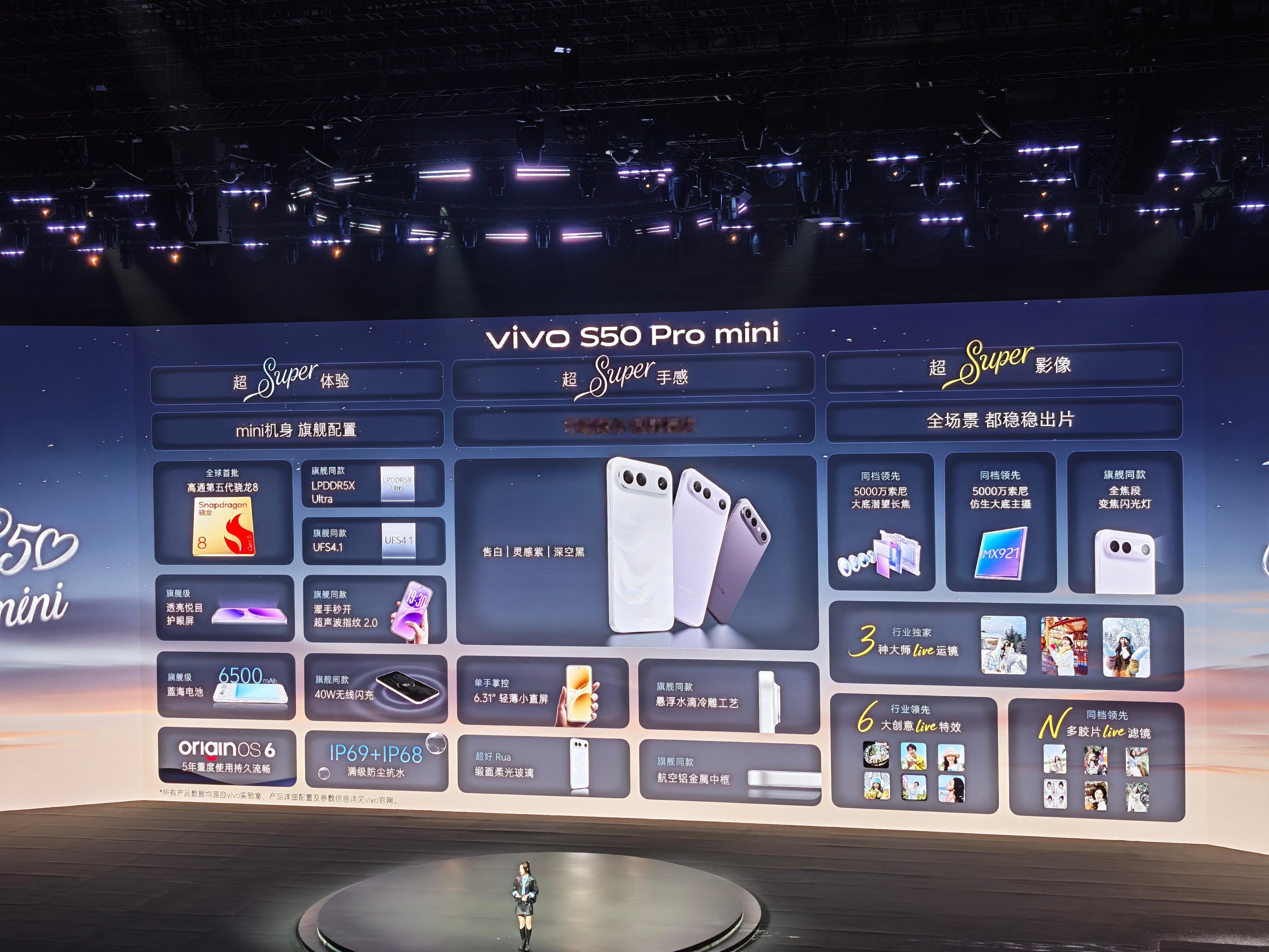 vivo发布会当大屏手机还在比拼「谁更像板砖」,vivo S50 Pro mini偏要反其道而行——6.31英寸小直屏+横向纯平Deco设计,像把银河揉进掌心。航空级铝金属机身覆着「灵感紫」渐变,冷雕工艺让边缘比初雪还细腻,192g重量单手握持时,仿佛握住一杯温热的奶茶,治愈又温柔。软萌的外观下,却藏着骁龙8 Gen5+LPDDR5X Ultra+UFS4.1的「性能铁三角」,跑分超300万,《原神》满帧跑、多任务切换丝滑到像在雪地里滑雪。更狠的是6500mAh蓝海电池+90W闪充,早上喝杯咖啡的时间就能充满,晚上追剧到凌晨都不用找充电器。影像更是是社交杀手锏,索尼IMX882潜望长焦一拍,3倍变焦把街角的烤红薯摊拍成电影海报。「大师Live运镜」一键生成Vlog大片,连宝丽来显影的声效都给你还原得明明白白。IP69+IP68防水让你雨天拍雪都不慌,3D超声波指纹2.0湿手解锁比暖宝宝还贴心。售价3699元起就能拥有掌心治愈神器,所以这个冬天别再被大屏绑架,vivo S50 Pro mini用小屏装下旗舰实力,让你单手掌控全场——毕竟真正的「狠角色」,从来都藏在温柔的外表下。