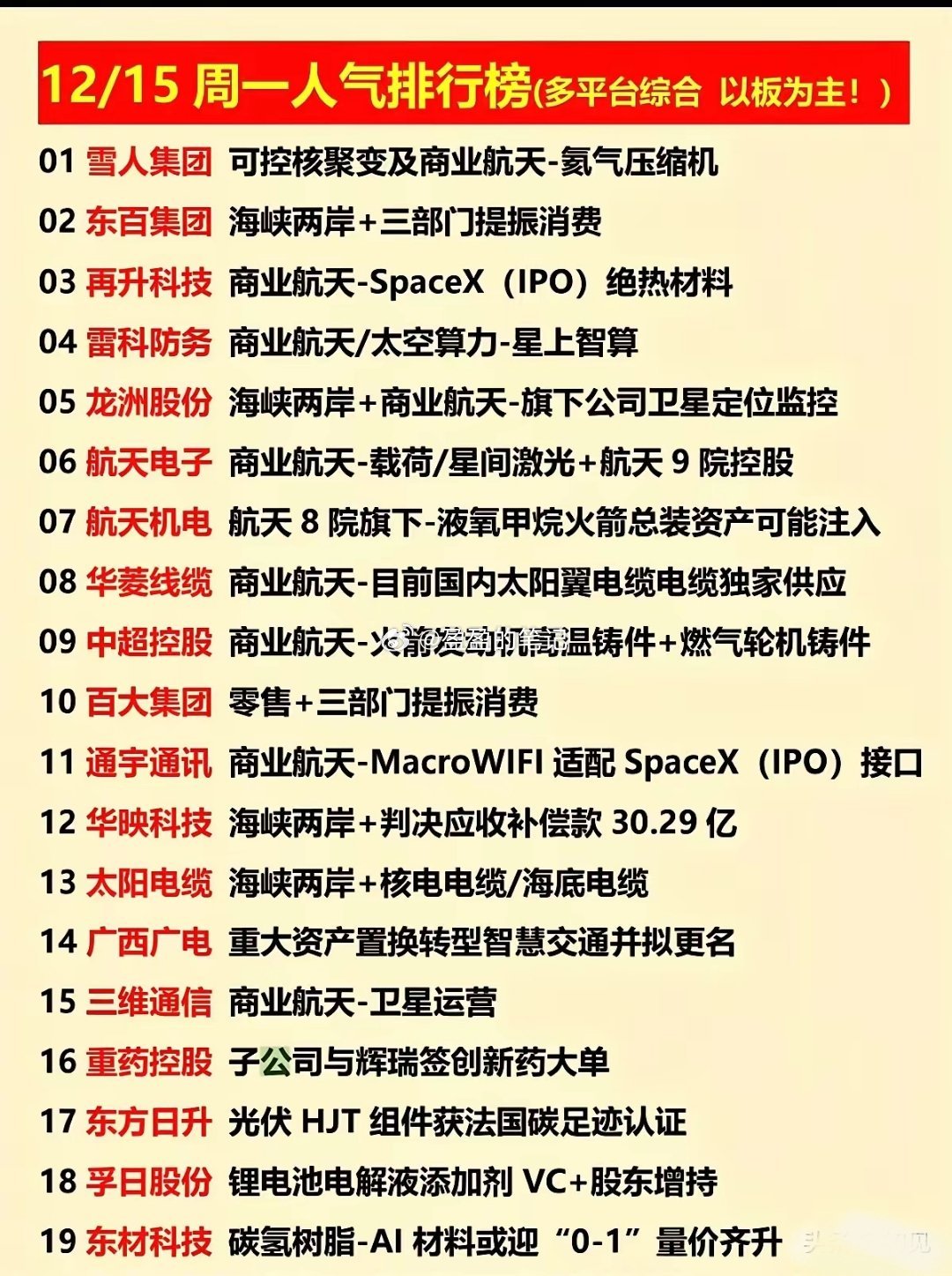 12月15日多平台综合的人气排行榜今天商业航天为绝对主线,其次是海峡两岸+消费构成核心副线,同时穿插光伏、锂电、医药、大麻等细分赛道题材。个股人气源于概念稀缺性、SpaceX IPO等事件驱动、政策提振及资产运作预期等多重因素。个股梳理分析1. 雪人集团:核心可控核聚变及商业航天-氦气压缩机。凭借氦气压缩机的技术稀缺性,叠加可控核聚变与商业航天双热门概念,成为榜单人气核心,是商业航天赛道中具备核心设备供应能力的标杆标的。2. 东百集团:核心海峡两岸+三部门提振消费。依托海峡两岸地域题材,叠加消费政策利好,成为消费与地域题材结合的核心标的,反映市场对消费复苏与地域经济的双重关注,人气关注度较高。3. 再升科技:核心商业航天-SpaceX(IPO)绝热材料。因绝热材料适配SpaceX IPO的事件驱动,绑定商业航天顶级赛道,技术适配性成为核心人气点,是商业航天赛道中细分材料领域的代表标的。4. 雷科防务:核心商业航天/太空算力-星上智算。聚焦商业航天的太空算力、星上智算细分方向,是商业航天赛道中“航天+算力”的稀缺标的,技术方向的独特性大幅推高其市场人气。5. 龙洲股份:核心海峡两岸+商业航天-卫星定位监控。兼具海峡两岸地域与商业航天卫星定位监控业务,是双题材融合的标的,旗下公司的业务落地成为其人气提升的关键支撑因素。6. 航天电子:核心商业航天-载荷/星间激光+航天9院控股。背靠航天9院的国企背景,主打商业航天载荷、星间激光技术,国企属性+核心技术双重加持,是商业航天赛道的核心国企标的。7. 航天机电:核心航天8院旗下-液氧甲烷火箭总装资产或注入。依托航天8院背景,叠加液氧甲烷火箭总装资产注入预期,资产运作预期成为核心人气驱动,属商业航天赛道的资产重估标的。8. 华菱线缆:核心商业航天-国内太阳翼电缆独家供应。凭借太阳翼电缆的国内独家供应地位,在商业航天赛道中具备绝对稀缺性,独家供应的属性使其成为细分领域的高人气标的。9. 中超控股:核心商业航天-火箭发动机高温铸件+燃气轮机铸件。聚焦商业航天火箭发动机高温铸件业务,是航天装备制造的细分标的,制造端的业务布局成为其市场人气的重要支撑点。10. 百大集团:核心零售+三部门提振消费。纯消费零售标的,依托消费政策提振的事件驱动,成为消费赛道的代表之一,虽无地域题材加持,仍凭借政策利好获得较高市场人气。11. 通宇通讯:核心商业航天-MacroWIFI适配SpaceX(IPO)接口。因MacroWIFI技术适配SpaceX IPO接口,绑定国际商业航天龙头事件,技术适配性成为其在商业航天赛道的核心人气亮点。12. 华映科技:核心海峡两岸+判决应收补偿款30.29亿。兼具海峡两岸题材与大额应收补偿款的事件驱动,财务层面的利好叠加地域题材,成为其人气提升的双重核心支撑因素。13. 太阳电缆:核心海峡两岸+核电电缆/海底电缆。依托海峡两岸地域题材,叠加核电、海底电缆的业务布局,是地域+高端线缆赛道融合的标的,业务多元化推高其市场关注度与人气。14. 广西广电:核心重大资产置换转型智慧交通并拟更名。无商业航天或海峡两岸主线题材,凭借资产置换转型智慧交通的资本运作事件,成为榜单中独特的资本运作类人气标的。15. 三维通信:核心商业航天-卫星运营。聚焦商业航天的卫星运营环节,是商业航天赛道中运营端的细分标的,业务环节的差异化使其在赛道中获得了一定的市场人气。16. 重药控股:核心子公司与辉瑞签创新药大单。属医药赛道标的,凭借子公司与辉瑞的合作大单事件驱动,成为医药领域的人气标的,是榜单中少见的医药题材代表标的。17. 东方日升:核心光伏HJT组件获法国碳足迹认证。光伏赛道标的,因HJT组件获国际认证,体现技术认可度,成为新能源赛道中光伏领域的人气代表,脱离主线却凭技术利好上榜。18. 孚日股份:核心锂电池电解液添加剂VC+股东增持。锂电赛道标的,兼具电解液添加剂业务与股东增持的双重利好,是新能源赛道中锂电细分领域的人气标的,获市场关注。19. 东材科技:核心碳氢树脂-AI材料或迎“0-1”量价齐升。聚焦AI材料领域的碳氢树脂,主打“0-1”的产业突破预期,是新材料+AI赛道的稀缺标的,产业预期成为其人气核心支撑。总结本次人气排行榜凸显商业航天的绝对主线地位,超半数标的围绕该赛道展开,稀缺技术、SpaceX IPO事件驱动、国企背景是核心人气抓手;海峡两岸+消费构成核心副线,政策与地域题材形成共振;光伏、锂电、医药等赛道则凭借技术认证、事件合作等单点利好成为补充,整体人气分布高度集中于有独家优势或强事件驱动的标的。本文涉及资讯、数据等内容来自网络公共信息,仅供参考,不构成投资建议!
