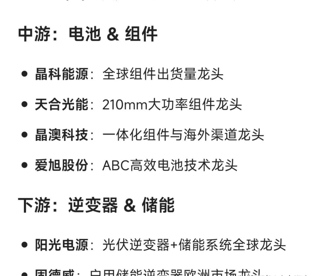 光伏产业链细分龙头全梳理上游:硅料&硅片- 通威股份:全球高纯晶硅领域领军者- 大全能源:专注N型硅料的细分龙头- 隆基绿能:单晶硅片龙头,HPBC电池技术优势显著- TCL中环:大尺寸G12硅片领域的标杆企业中游:电池&组件- 晶科能源:全球光伏组件出货量冠军- 天合光能:210mm大功率组件的核心代表- 晶澳科技:具备一体化组件实力,海外渠道布局领先- 爱旭股份:ABC高效电池技术的先行者下游:逆变器&储能- 阳光电源:光伏逆变器与储能系统的全球双料龙头- 固德威:欧洲户用储能逆变器市场的核心玩家辅材&设备- 福斯特:全球光伏胶膜(EVA/POE)领域的绝对龙头- 福莱特:光伏玻璃行业第二梯队的头部企业- 迈为股份:HJT电池整线设备的龙头厂商- 晶盛机电:单晶炉及碳化硅设备的核心供应商- 帝尔激光:光伏激光掺杂、开槽设备的技术标杆电站开发&运营- 三峡能源:国内新能源电站投资运营的龙头企业- 正泰新能(正泰电器旗下):户用光伏装机领域的领军品牌