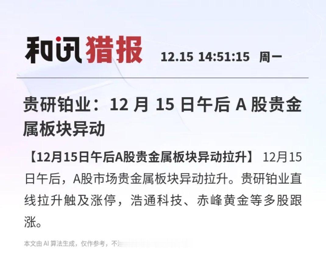 贵金属板块午后掀异动 贵研铂业领衔冲高12月15日午后,A股贵金属板块迎来一波快速拉升行情。贵研铂业直线冲高并触及涨停板,浩通科技、赤峰黄金等多只板块内个股同步跟涨,板块热度快速升温。我可以帮你整理贵金属板块异动的近期催化因素,需要吗?
