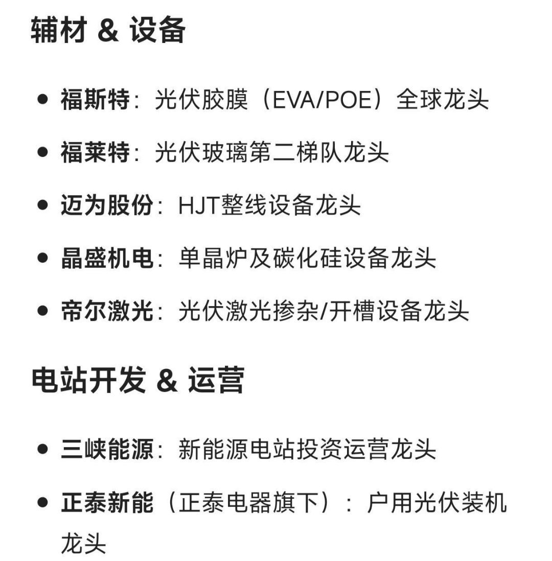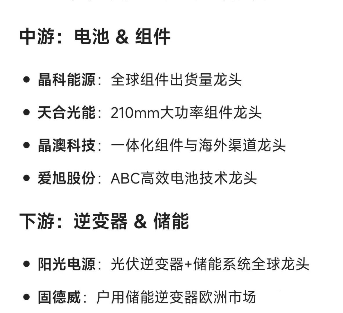 光伏概念细分龙头企业汇总:上游:硅料&硅片通威股份:全球高纯晶硅(硅料)龙头大全能源:N型硅料龙头隆基绿能:单晶硅片及HPBC电池技术龙头TCL中环:大尺寸(G12)硅片龙头中游:电池&组件晶科能源:全球组件出货量龙头天合光能:210mm大功率组件龙头晶澳科技:一体化组件与海外渠道龙头爱旭股份:ABC高效电池技术龙头下游:逆变器&储能阳光电源:光伏逆变器+储能系统全球龙头固德威:户用储能逆变器欧洲市场龙头辅材&设备福斯特:光伏胶膜(EVA/POE)全球龙头福莱特:光伏玻璃第二梯队龙头迈为股份:HJT整线设备龙头晶盛机电:单晶炉及碳化硅设备龙头帝尔激光:光伏激光掺杂/开槽设备龙头电站开发&运营三峡能源:新能源电站投资运营龙头正泰新能(正泰电器旗下):户用光伏装机龙头