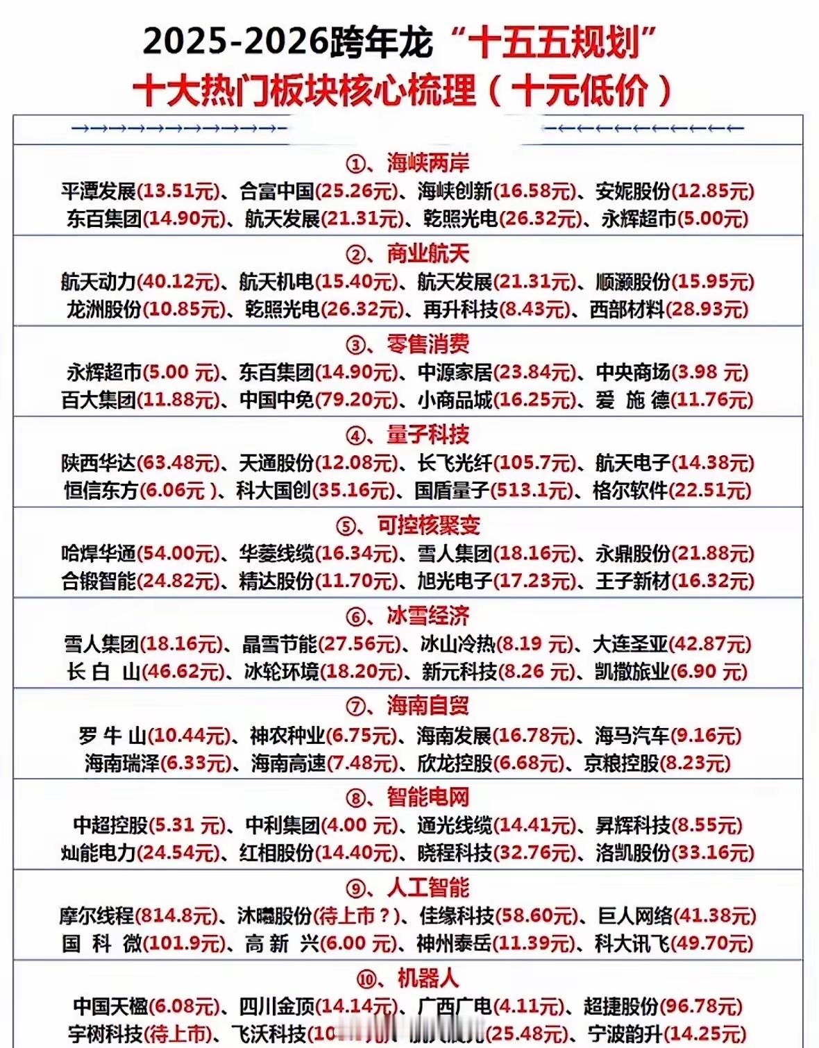 "10元以下的十五五跨年龙热点板块与个股:两岸发展、商业航天、零售消费、量子科技、核聚变、冰雪经济、海南自贸、智能电网、人工智能、机器人,潜力股集结!"